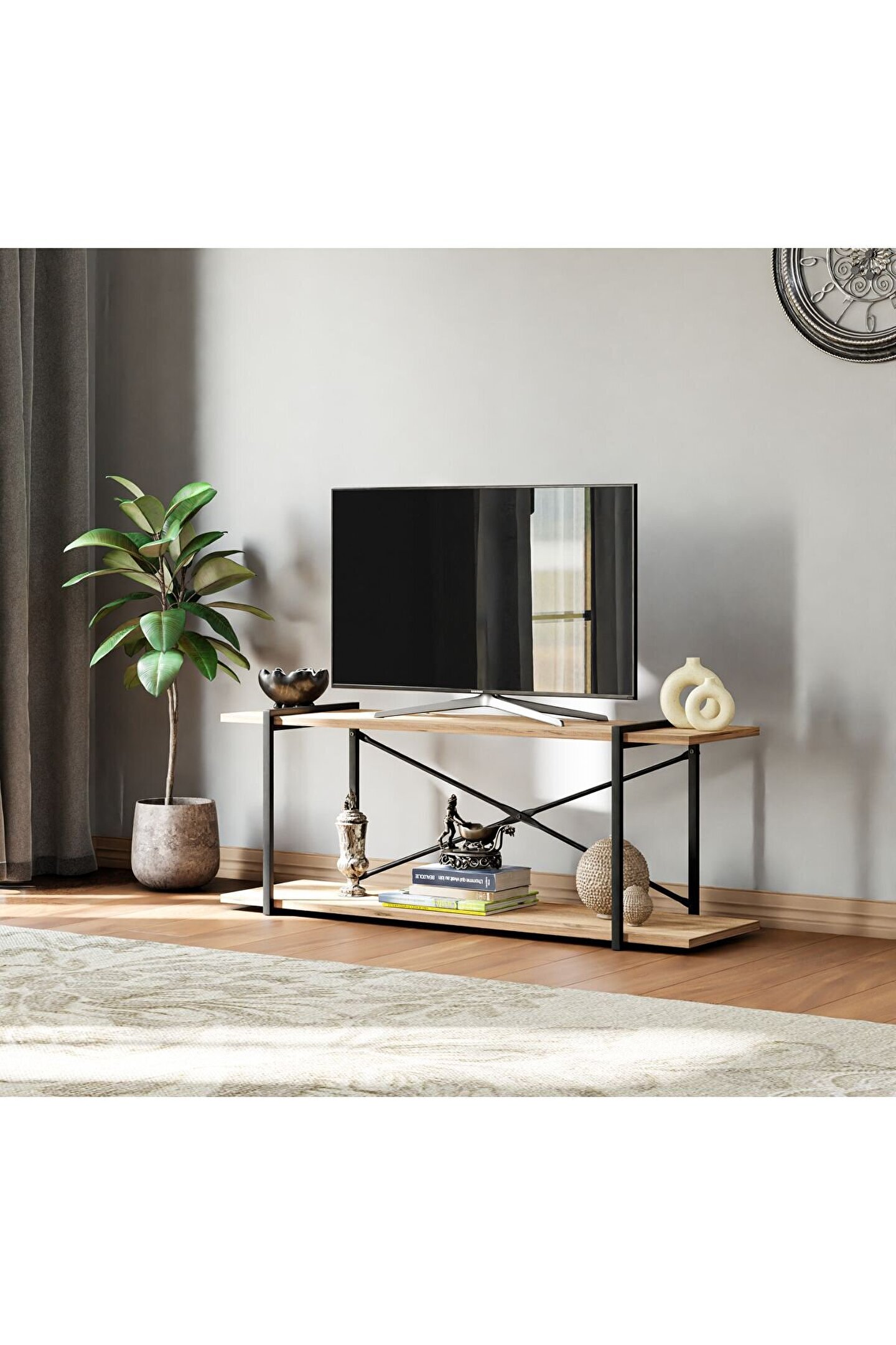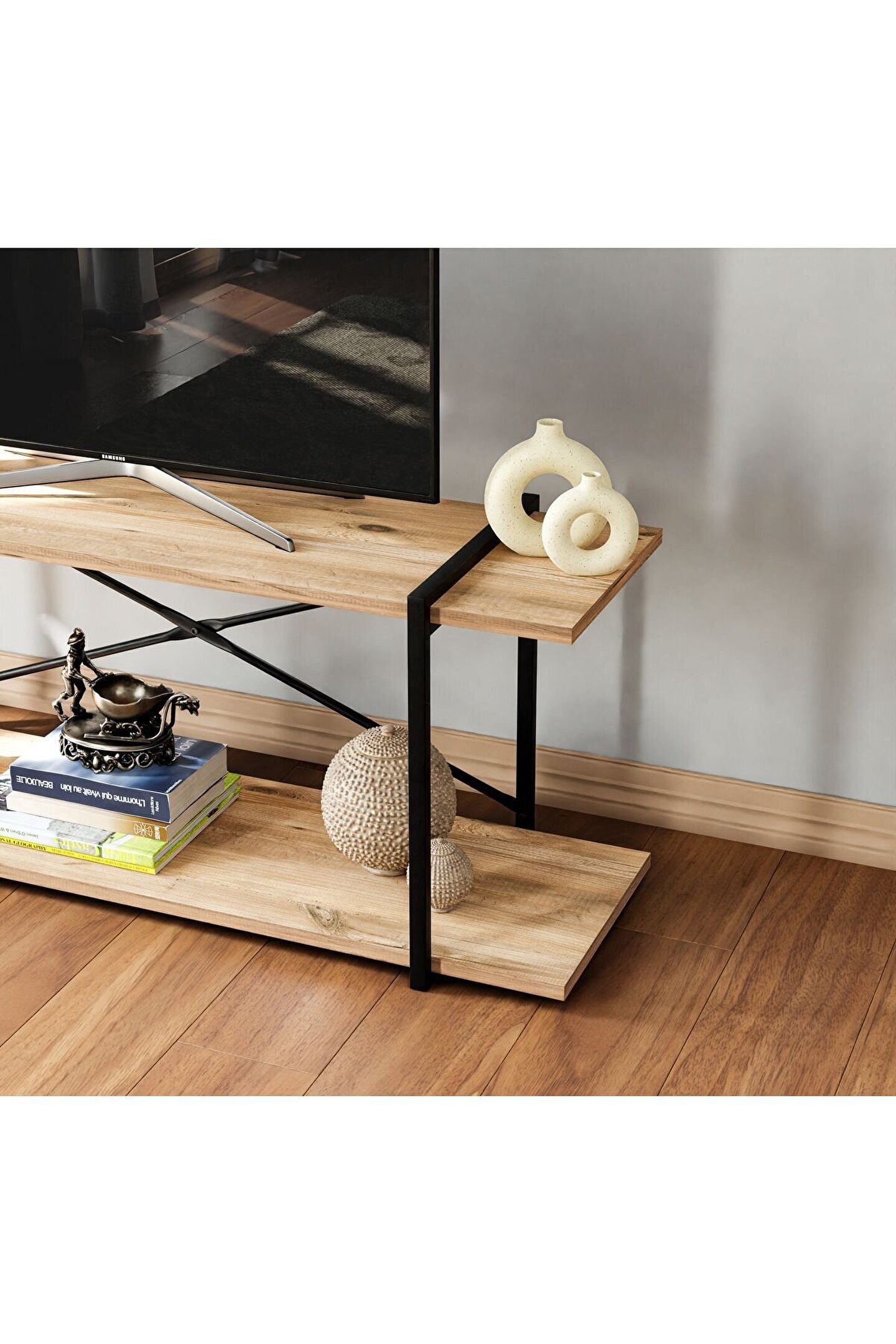 Modern ve şık tasarımıyla dikkat çeken Televizyon ünitesi, çam ağacından üretilmiş olup dayanıklılığı ve estetiği bir arada sunar; Raflı yapısı sayesinde ekstra depolama alanı sağlar, kitaplarınızdan DVD'lerinize kadar çeşitli eşyalarınızı düzenli bir şekilde saklamanızı kolaylaştırır;