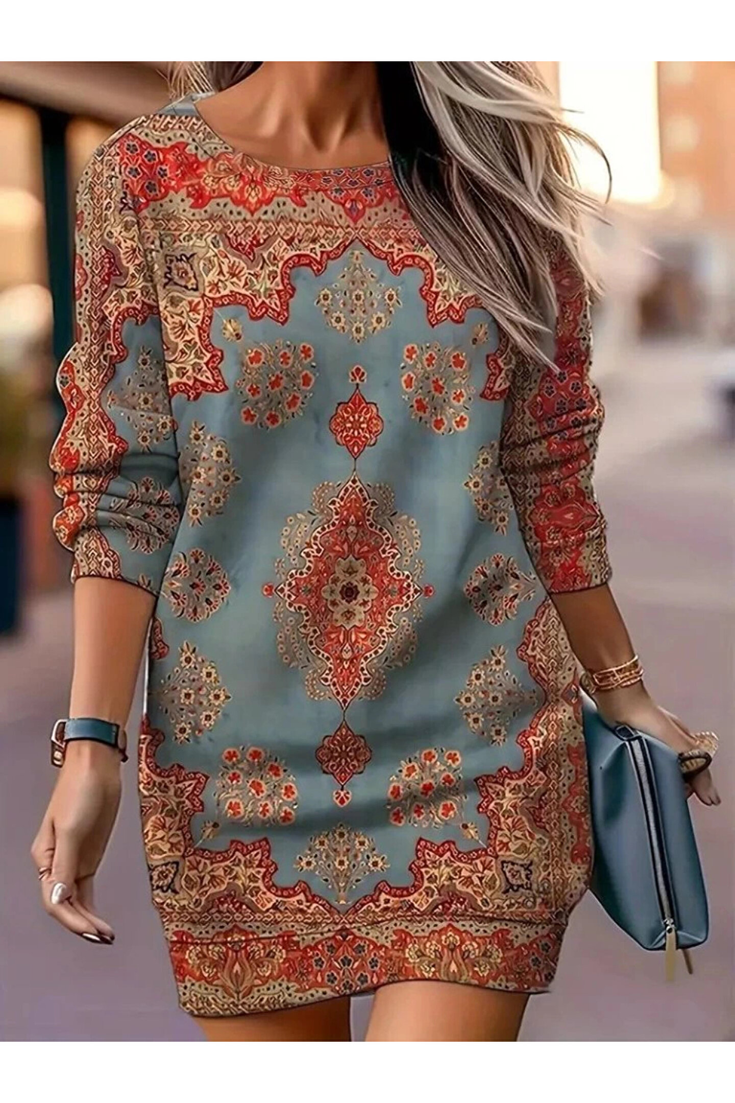 Kadın Uzun Kollu Yuvarlak Yaka Desenli Mini Modal Elbise