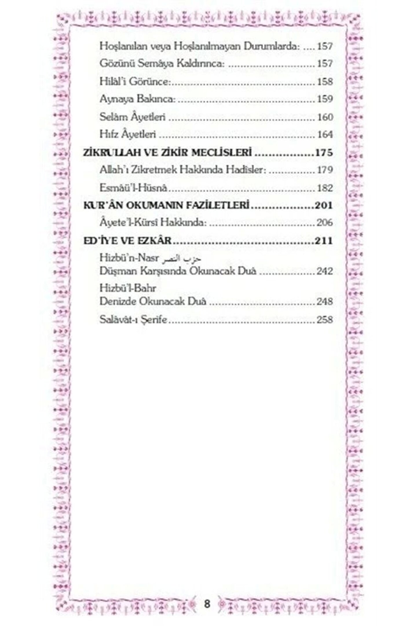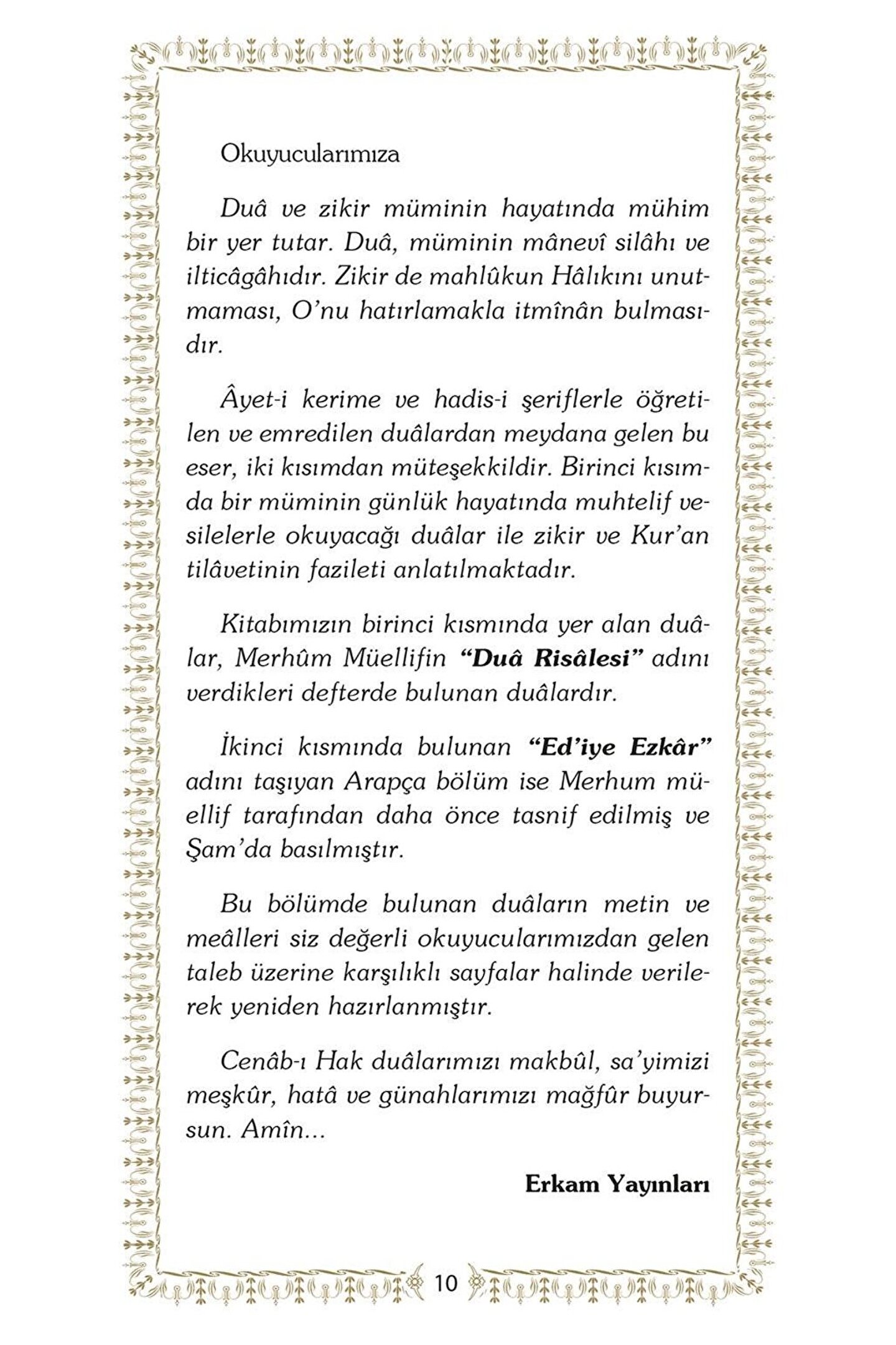 Peygamberimizin hayâtı, yaşanan her ânı dualarla dokumanın mümkün ve hatta elzem olduğunu gösteren tarihi bir vesika olarak önümüzde durmakta.; O "dua ibâdetin özüdür” diye tenbih eder ümmetine.; Elinizdeki dualar demeti merhum müellifin sevenlerine tavsiyesi mahiyetindedir.; Abdest alırken dua, eve girerken dua, yola çıkarken dua.; Kandil gecelerinde dualar.; Bollukta dua, darlıkta dua.; Gündüzlerin meşakkati dualarla aşılacak, geceler zikirlerle aydınlanacak.