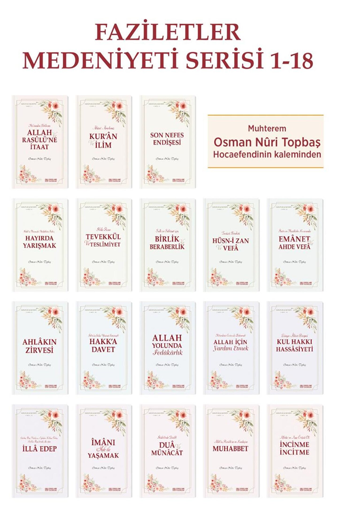 Osman Nuri Topbaş Hocaefedi'nin 18 kitaptan oluşan Faziletler Medeniyeti Serisi tamamlandı; Kitaplar: Allah Rasulüne İtaat Kur'an ve İlim Son Nefes Endişesi Tevekkül ve Teslimiyet Birlik ve Beraberlik Hayırda Yarışmak Hüsn; i Zan ve Vefa Emanet ve Ahde Vefa Ahlakın Zirvesi Hakk'a Davet Allah Yolunda Fedakarlık Allah İçin Yardım Etmek Kul Hakkı Hassasiyeti İlla Edep İmanı Aşk ile Yaşamak Dua ve Münacat Muhabbet İncinme İncitme;