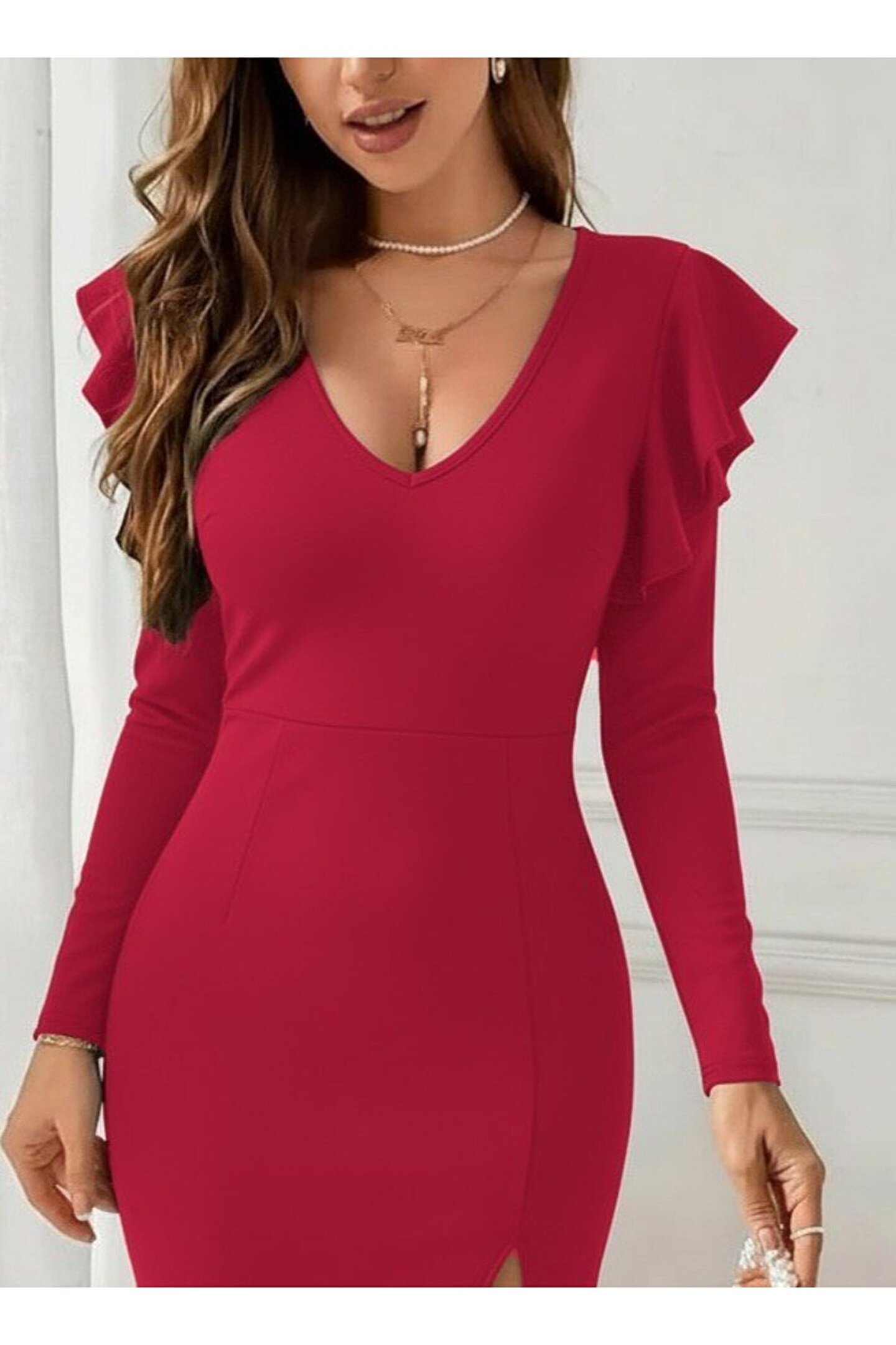 Kadın Uzun Kollu V Yakalı Yandan Yırtmaçlı Midi Ithal Krep Elbise
