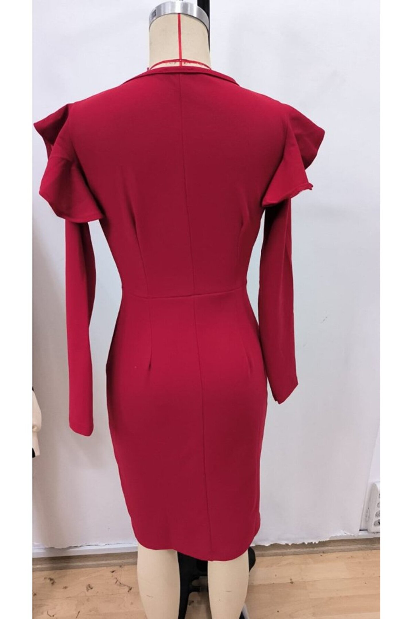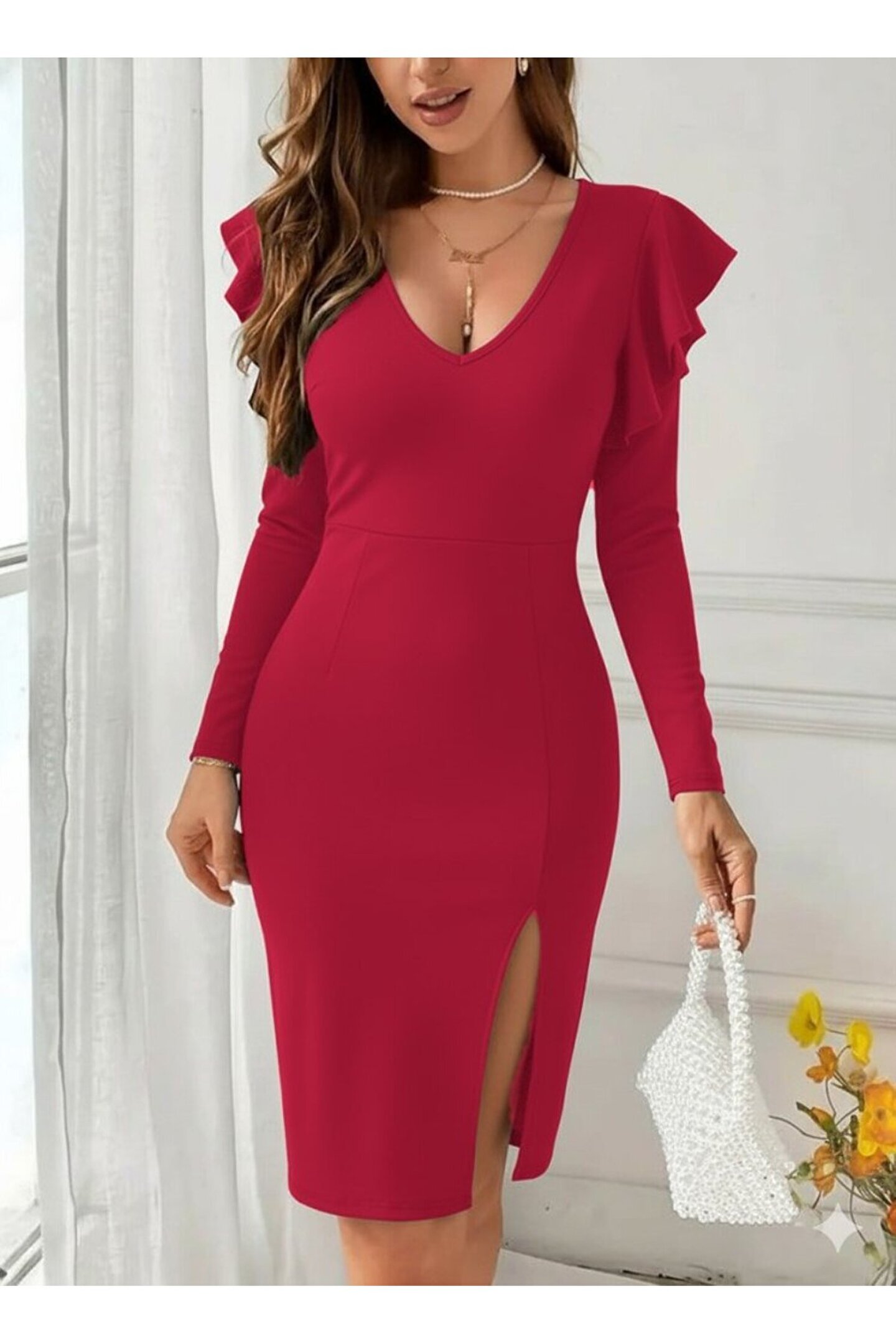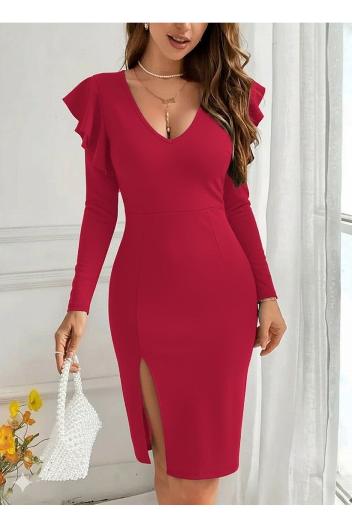 ermege EQURİ Kadın Uzun Kollu V Yakalı Yandan Yırtmaçlı Midi Ithal Krep Elbise