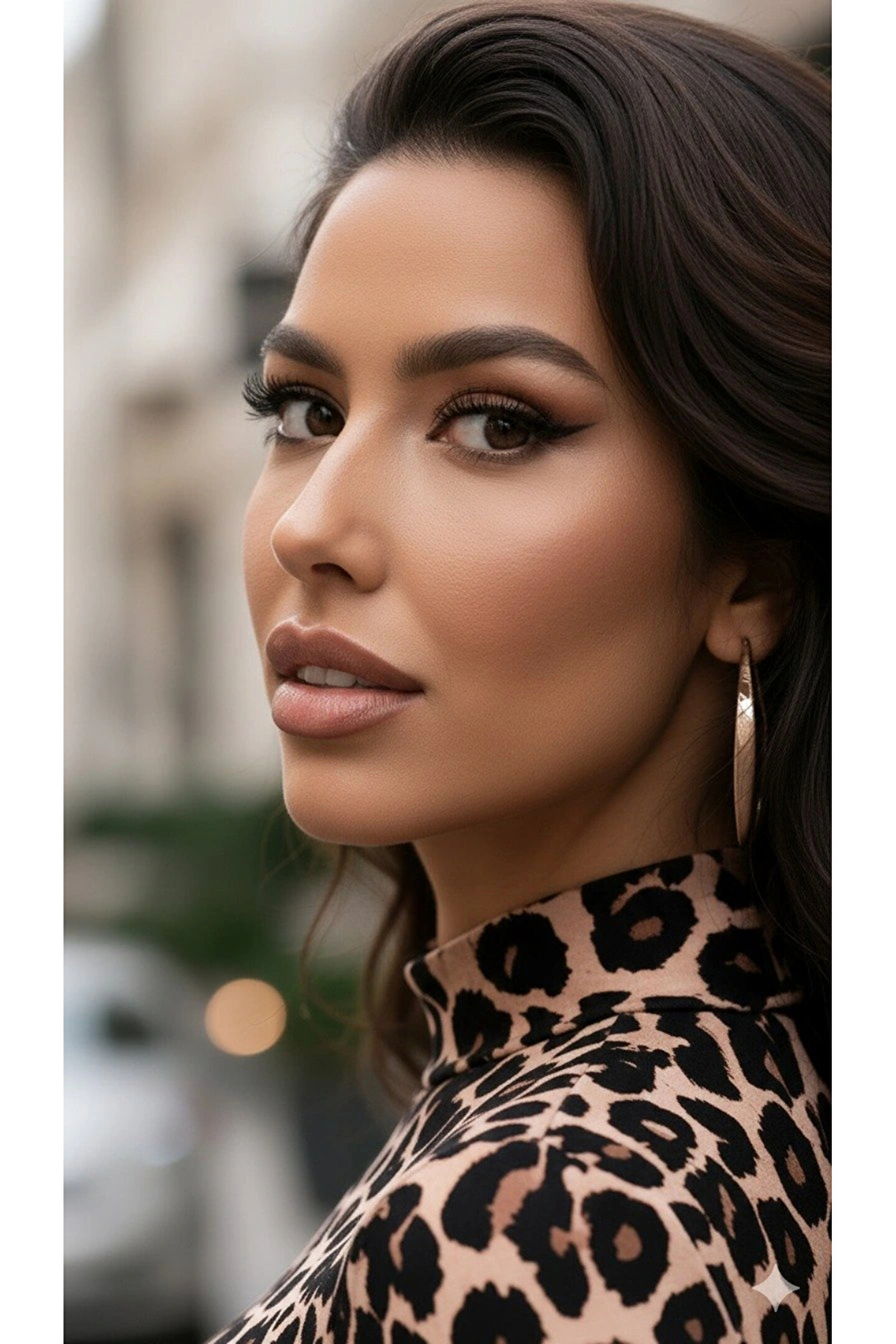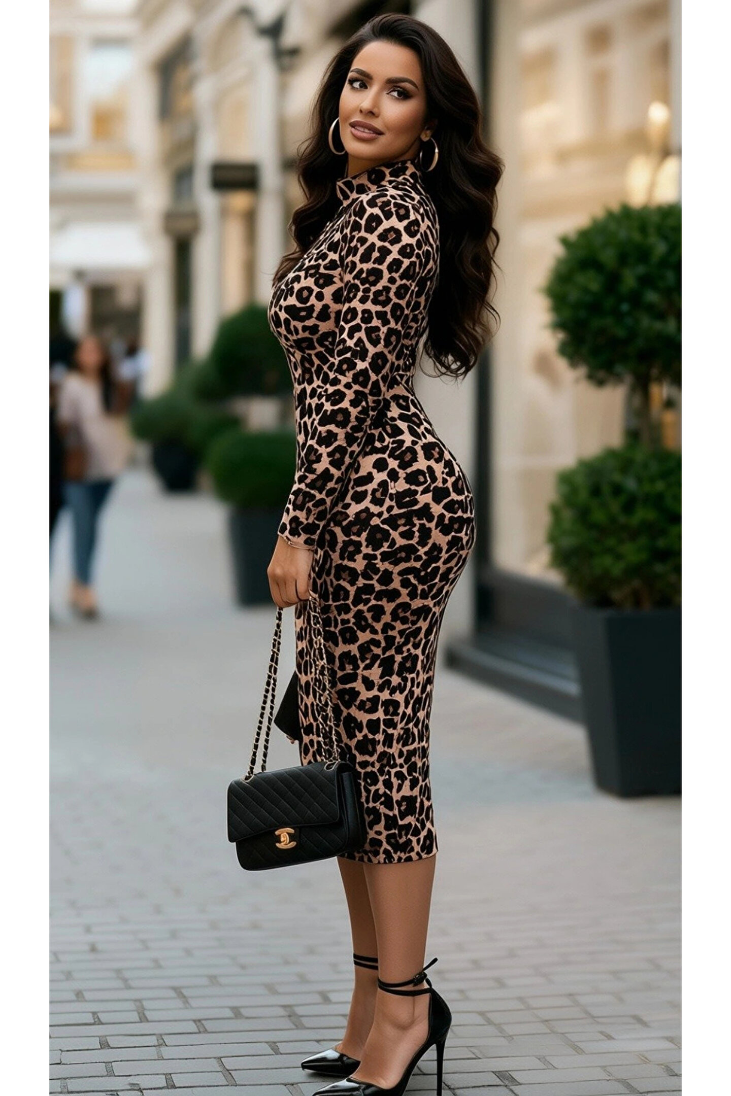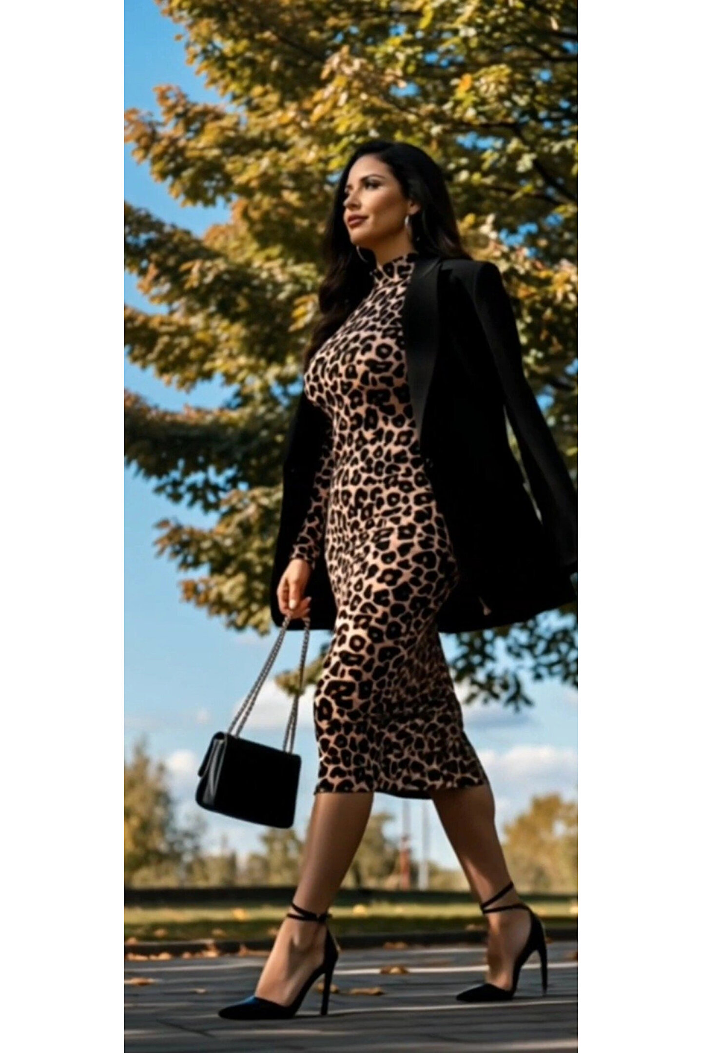 Kadın Uzun Kollu Balıkçı Yaka Leopar Desenli Midi Boy Elbise