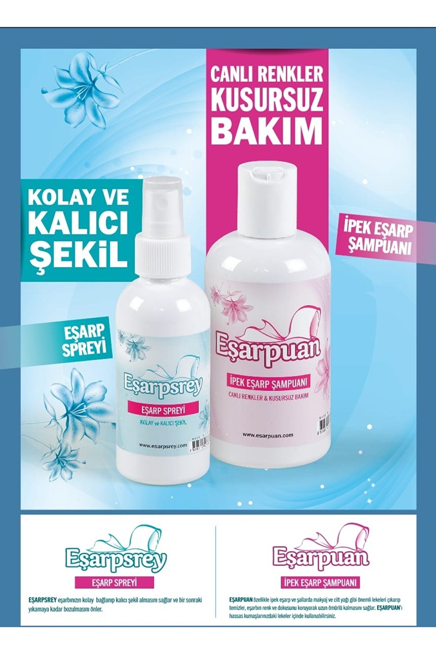 Eşarpuan® , Tüm makyaj lekelerinde etkili Eşarp Şampuanıdır. Hem tüm inatçı lekeleri çıkartır hem de Canlı renkleri koruma özelliğine sahiptir. EŞARPUAN® Özellikle ipek eşarp ve şallarda makyaj ve cilt yağı gibi problemli lekeleri çıkarıp temizler. Eşarbın renk ve dokusunu koruyarak uzun ömürlü kalmasını sağlar. EŞARPUAN’ı hassas kumaşlarınızdaki lekeler için de kullanabilirsiniz. KULLANIM TALİMATI 1 litre ılık suya iki kapak EŞARPUAN® ilave ederek karıştırın Hafifçe çitileyerek yıkayın Ağır ve çıkmayan lekelere direk uygulanabilir Bu uygulamadan sonra eşarbı soğuk suda durulayın Eşarbınızı nemli iken tersinden ütülemeniz tavsiye edilir. Tüm makyaj lekelerinde etkili, inatçı lekeleri çıkartır. ; Canlı renkleri koruma özelliğine sahiptir, eşarplarınız daima parlak ve canlı kalır. ; Özellikle ipek eşarp ve şallarda makyaj ve cilt yağı gibi problemli lekeleri çıkarır. ; Eşarbın rengini ve dokusunu korur, uzun süreli kullanım sağlar. ; Hassas kumaşlarınızdaki lekeler için de güvenle kullanabilirsiniz. ; Eşarpuan® ile eşarplarınızda bir leke endişesi olmadan gönül rahatlığıyla dolaşın. Gelişmiş formülü sayesinde tüm makyaj lekelerine veda edin ve eşarplarınızın güzelliğini uzun süre koruyun. Ürün linki ;
