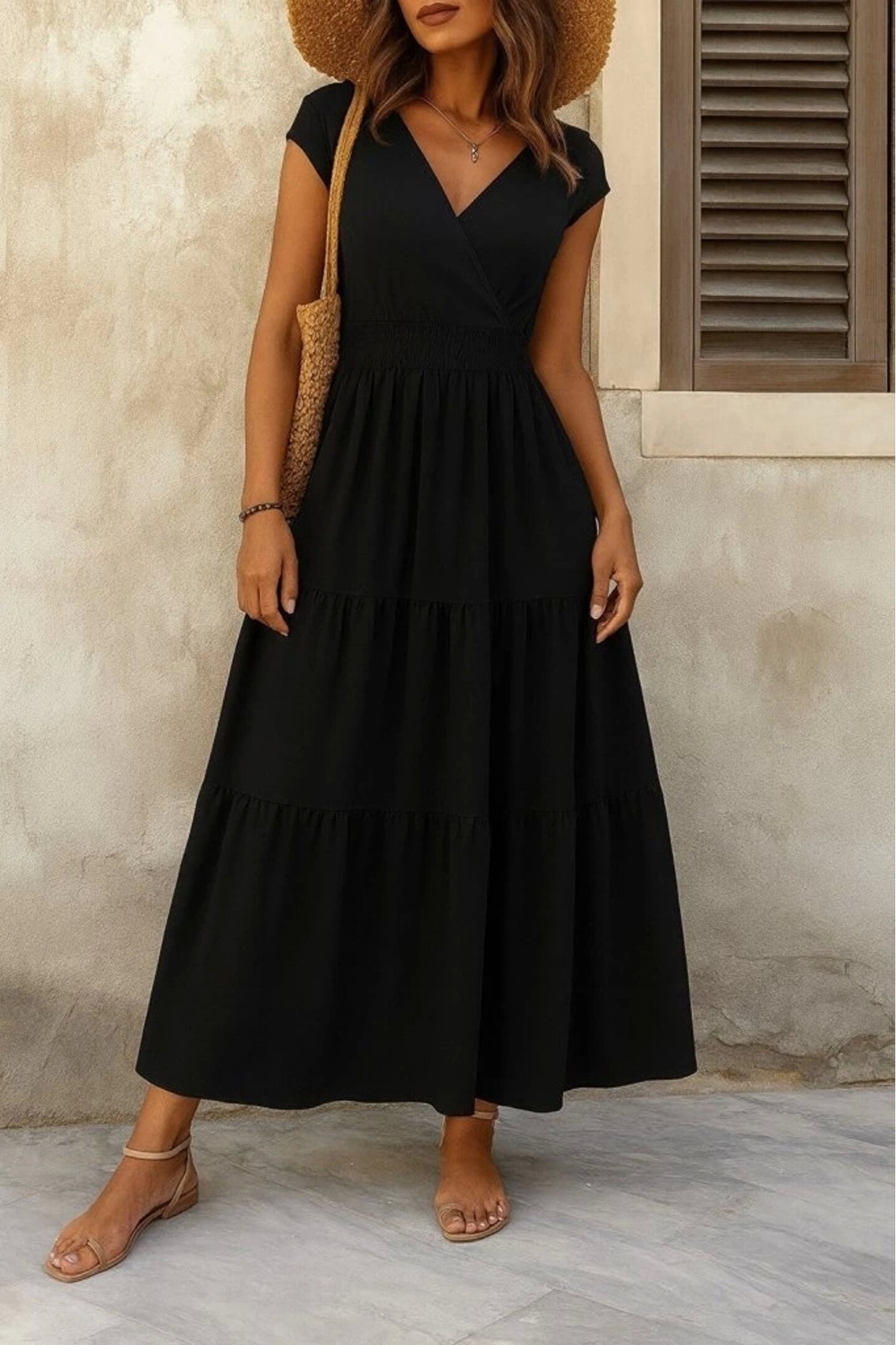 ESSE BUTİK Kadın Kısa Kollu Kruvaze Yaka Beli Lastikli Süprem Maksi Boy Elbise
