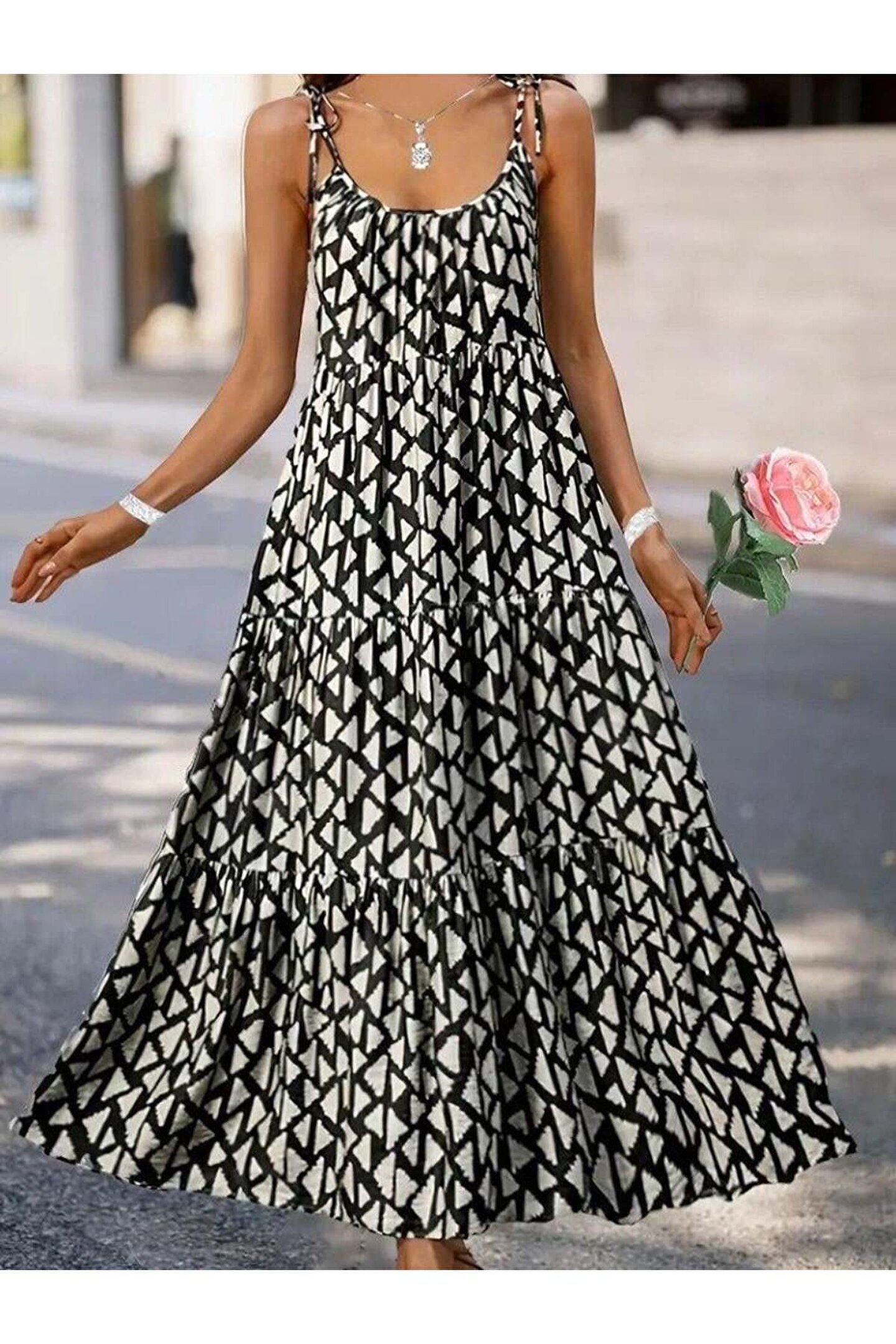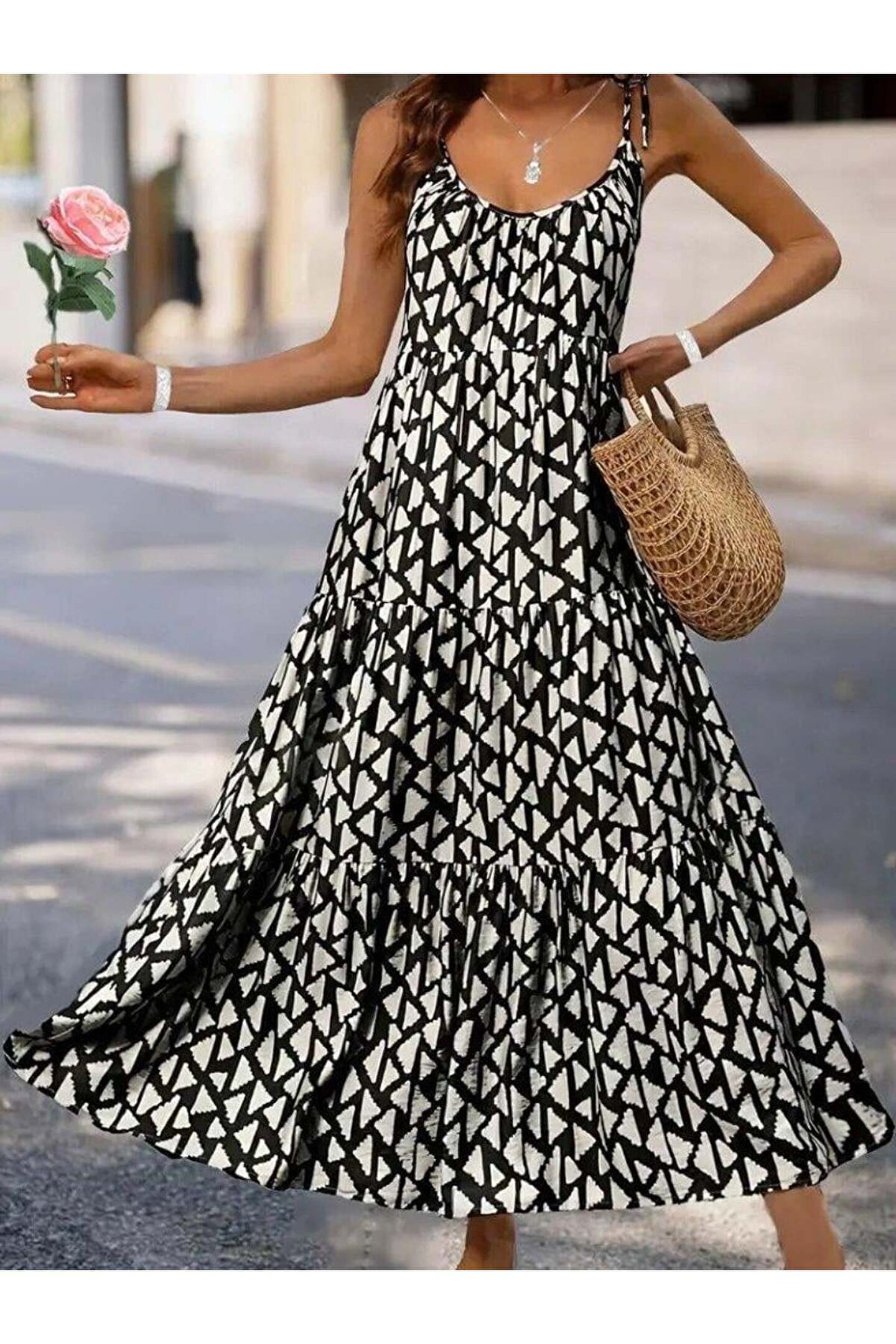 - Zarif tasarımıyla dikkat çeken askılı yuvarlak yaka fırfırlı desenli uzun elbise, yaz aylarının vazgeçilmez parçasıdır.; - Kapsız yapısı ile rahatlık sunarken, kemer detayına ihtiyaç duymadan şıklığınızı tamamlamanızı sağlar.; - Astarsız oluşu sayesinde hafif ve ferah bir kullanım imkanı tanırken, bürümcük dokusuyla göz alıcı bir görünüm kazandırır.; - Sürdürülebilir malzemelerden üretilmiş olup, çevre dostu tercihler yapmanızda size eşlik eder.; - Fashion Forward koleksiyonuna ait bu elbise, günlük kullanımda trendleri takip etmenizi kolaylaştırır.; - Ilık su ile yıkama önerisiyle bakımının pratik ve zahmetsiz olmasını sağlar; böylece zamandan tasarruf edersiniz.; - Ek özellik bulunmayan bu modelde sade güzellik ön planda tutulmuştur; her ortamda zarafetinizi korumanız için idealdir.; - Pamuk, polyester ve elastan karışımından oluşan materyali esneklik sunarak gün boyu konforlu hissetmenize olanak tanır.; - Casual koleksiyonun bir parçası olarak günlük giyimde rahatlıkla tercih edebileceğiniz bu elbise, stil sahibi görünümünüzü pekiştirir.; - İnce kalıbıyla vücut hatlarınıza uyum sağlayarak feminen siluetinizi ön plana çıkartır.; - Trend ortamlarda fark yaratmak isteyenler için mükemmel seçimdir; her anınıza uyum sağlayacak şekilde tasarlanmıştır.; - Askılı kol tipi sayesinde omuzlarınızda yük olmadan serinlik hissi yaşatırken, kare yaka detayı modern çizgilere sahiptir.; - Tekli paketiyle kolayca satın alınabilir ve gardrobunuza ekleyebilirsiniz; ekstra kutuya ihtiyaç duymadan pratik kullanım vaad eder.; - Belirtilmemiş kumaş tipine sahip olmasıyla farklı dokular arasında geçiş yapabilme esnekliği sunarken, uzun boy kesimiyle zarif duruşunu korur.