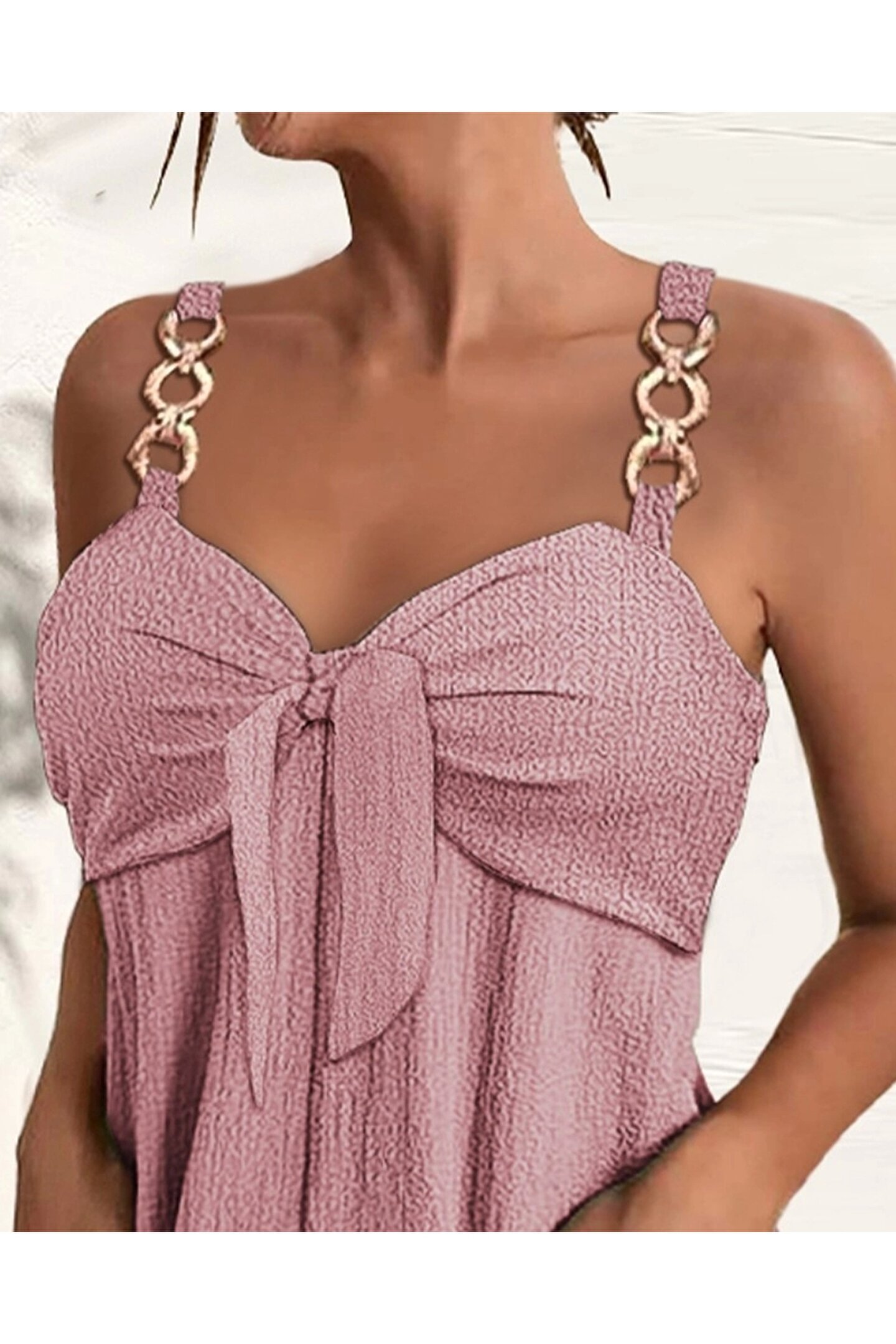 ESSFASIHON Kadın Kolsuz Askı Aksesuarlı önü Bağlama Detay Salopet şort Tulum