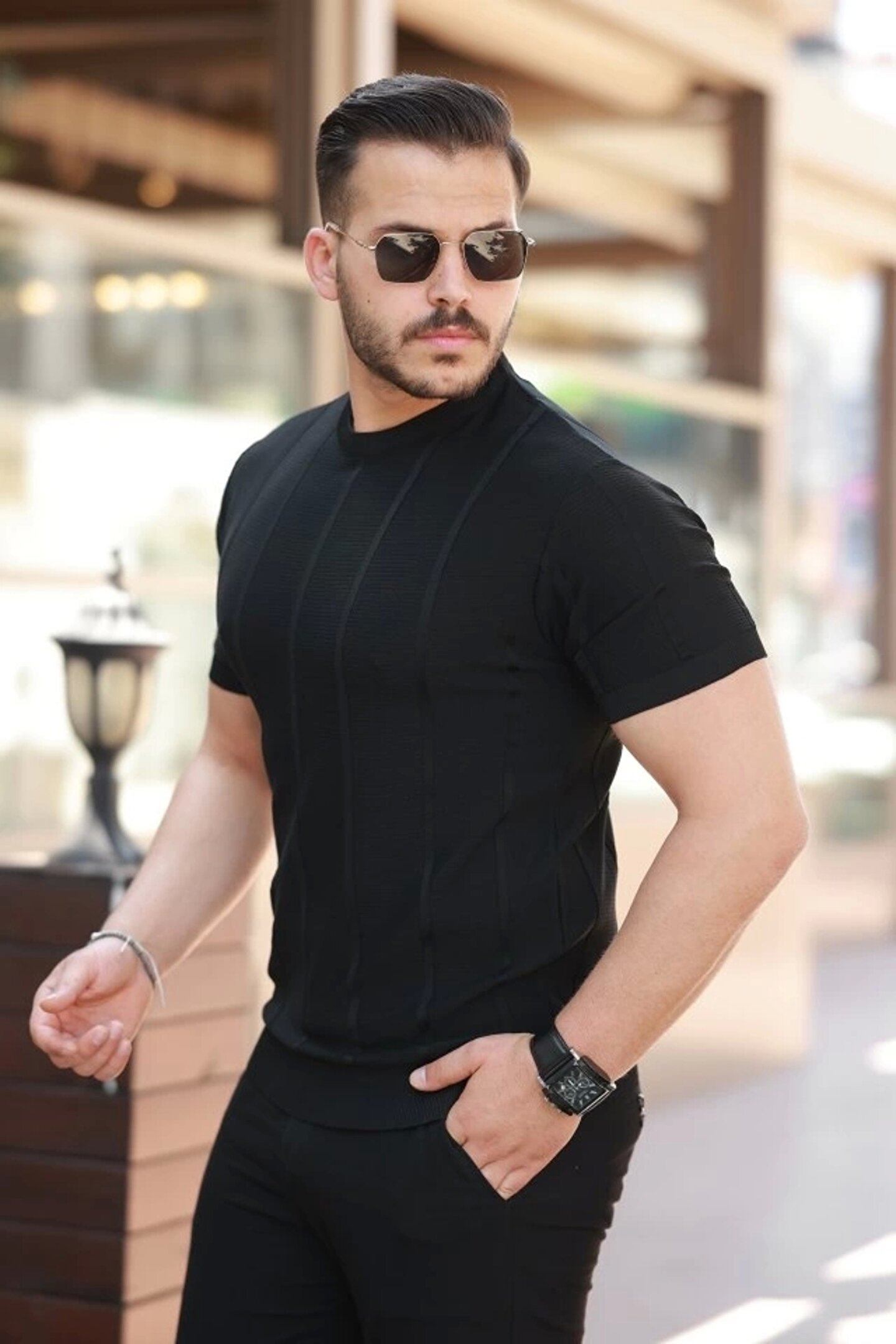 Erkek Desenli çizgi Kabartmalı Kısa Kollu Tişört
