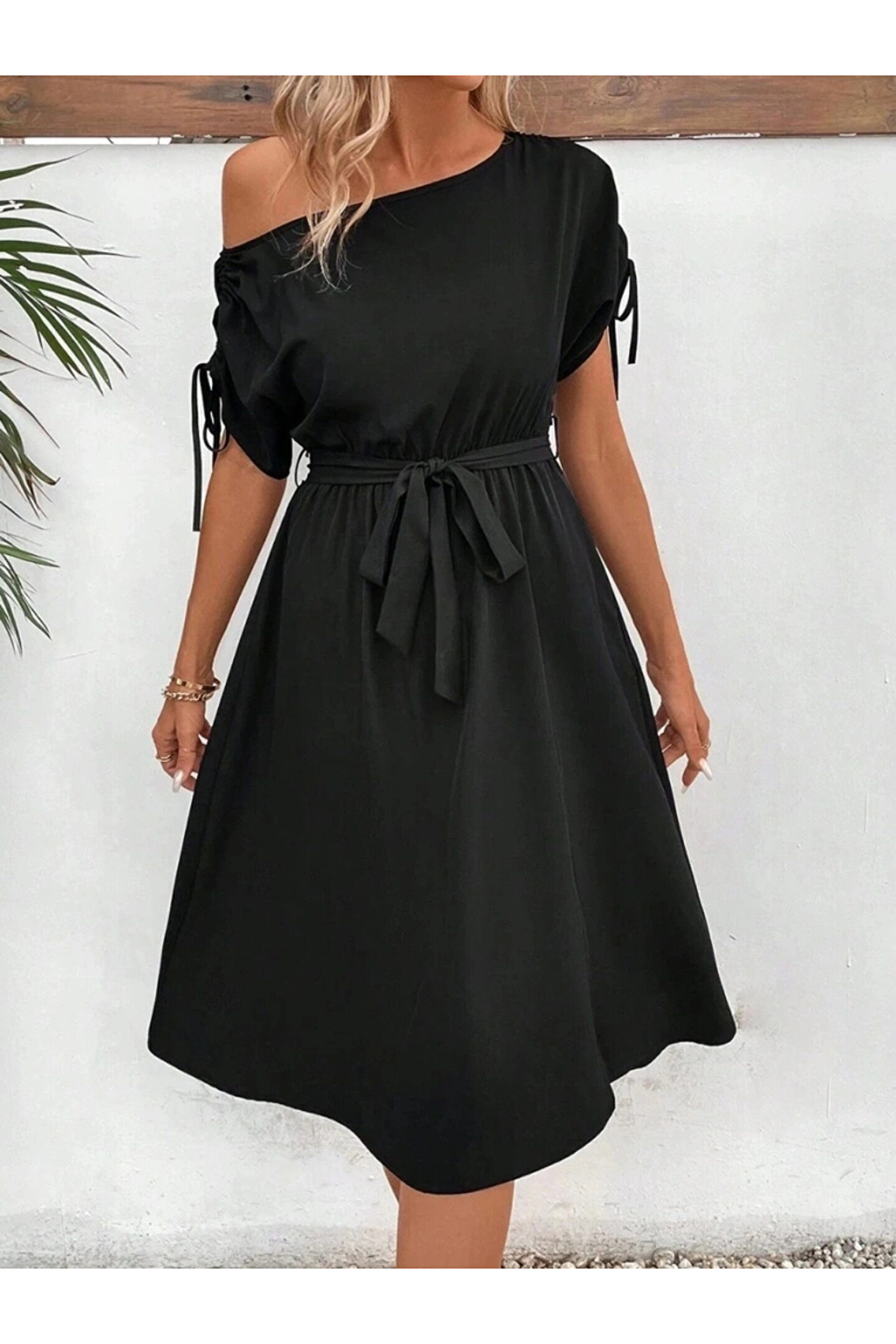 ETİLER COLLECTION Kadın Tek Omuzu Açık Kol Ucu Fiyonklu Belden Kuşaklı Yırtmaç Detaylı Viskon Elbise