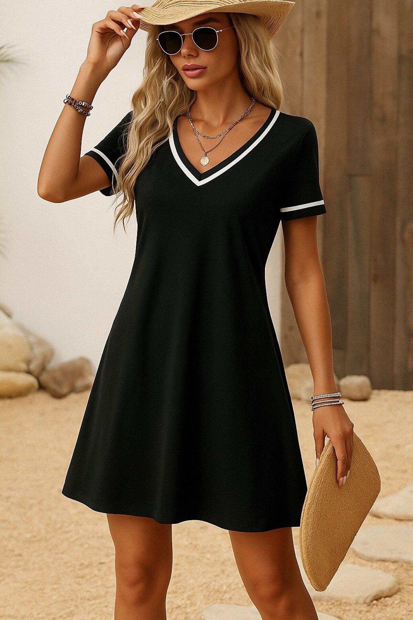 Kadın Kısa Kollu V çizgili Yakalı Kısa Viskon Elbise