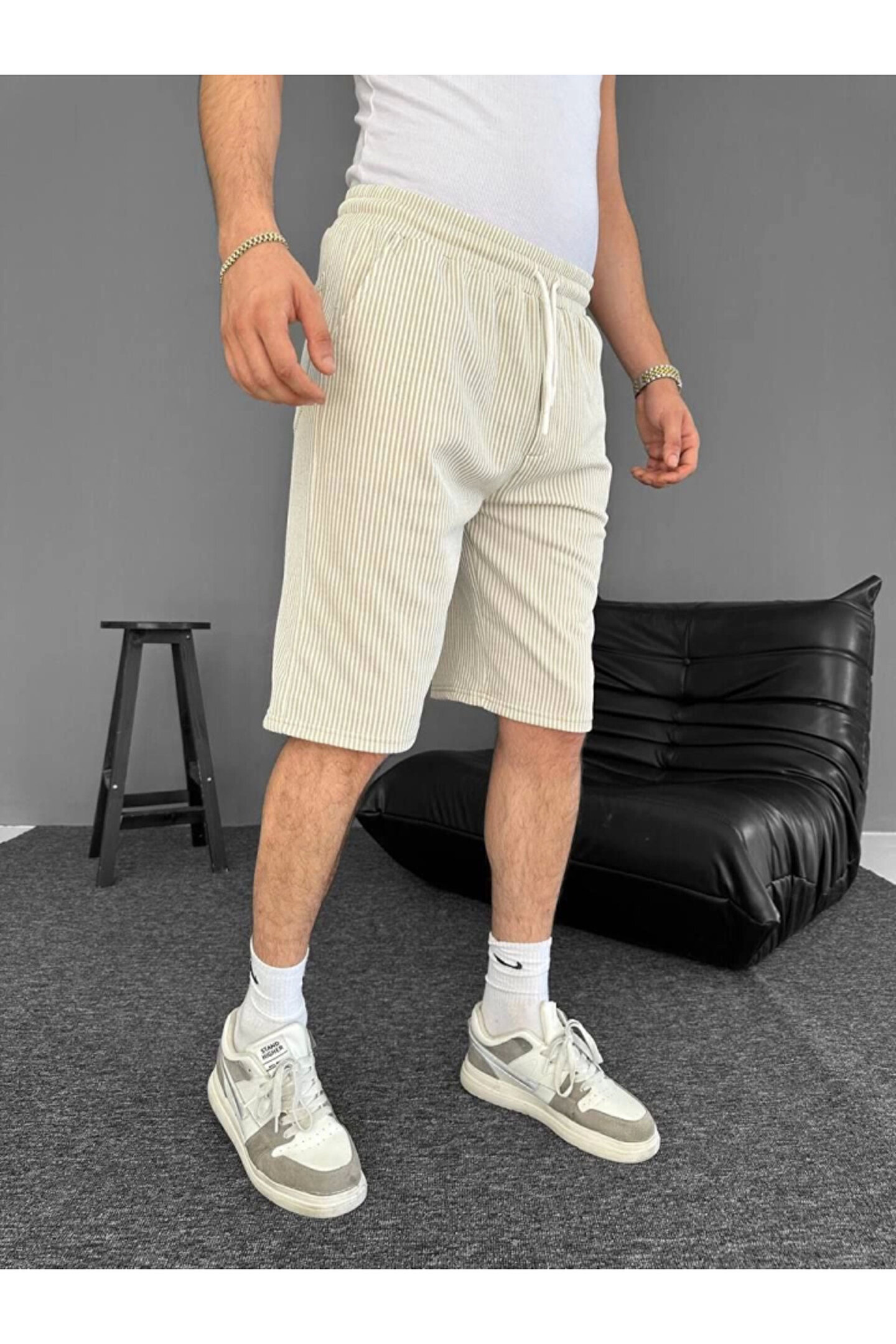 Su Yolu Çizgili Cepli Şort- Bej