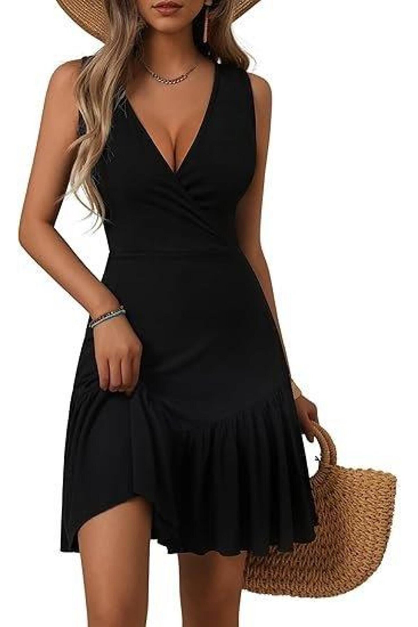 EYCAWEAR Kadın Askılı Kruvaze Yakalı Fırfırlı Janjan Krep Elbise