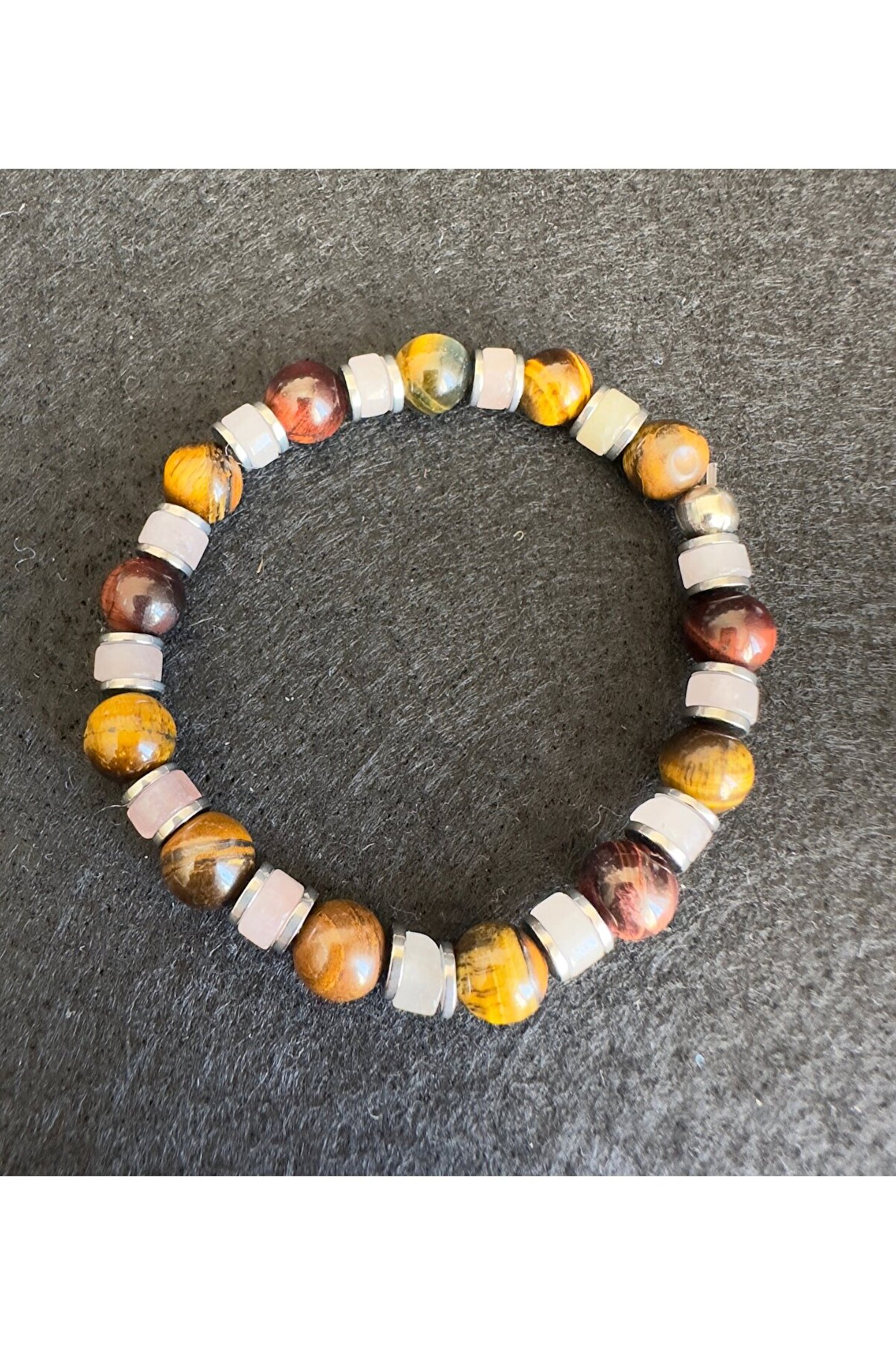 Çakra tasarım modelidir.; kaplan gözü ve kuvars kullanılmıştır.; ara bağlantılar hematit taşıdır.; unisex kullanıma uygundur.; her yaş grubu için uygundur.; esnek ipi sayesinde her bileğe uygun olur.