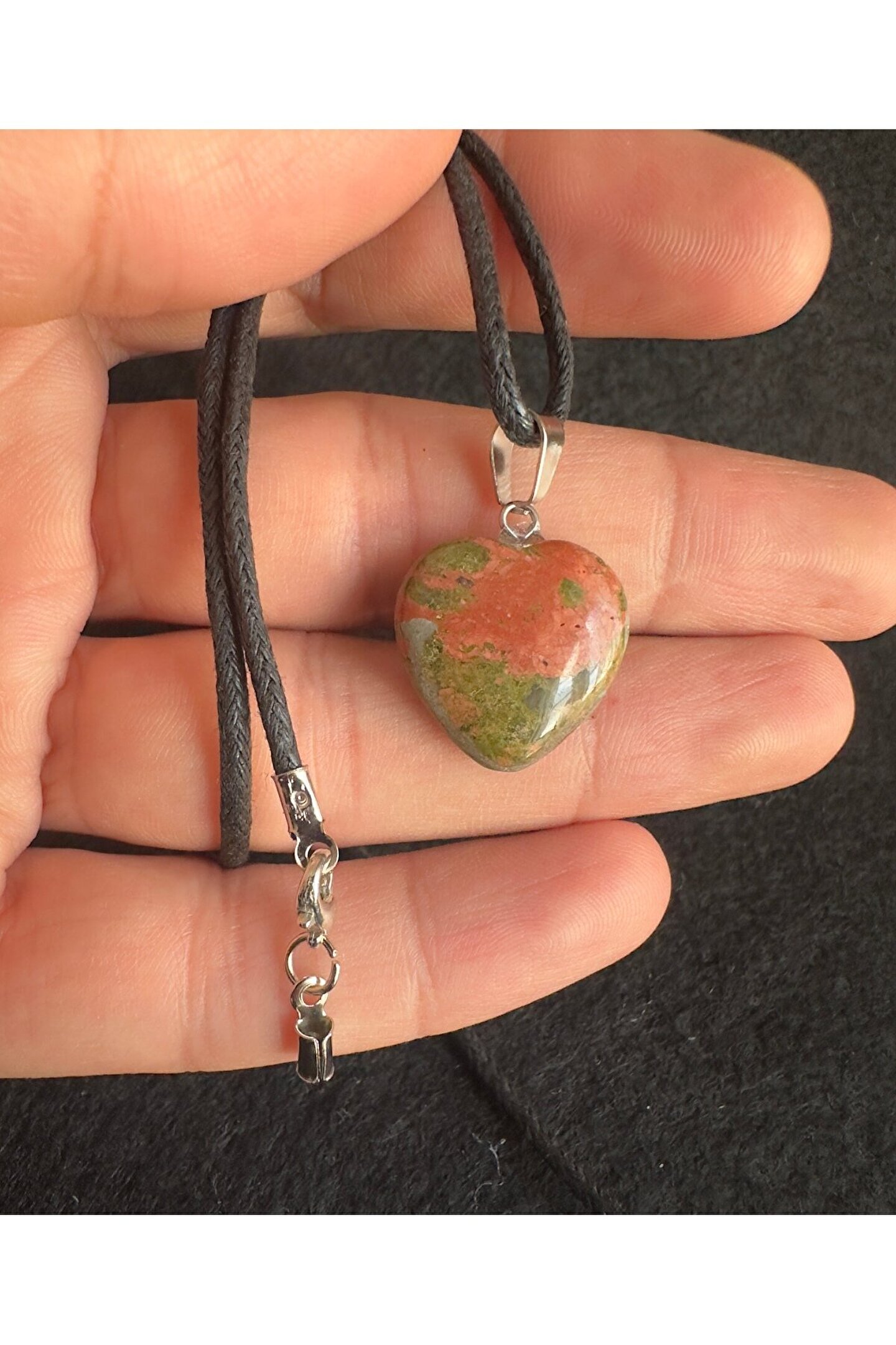 Kalp kesim Unakit taşı kolye uçu modelidir.; Klipsli Kolye ipi ile beraber gönderim sağlanır.