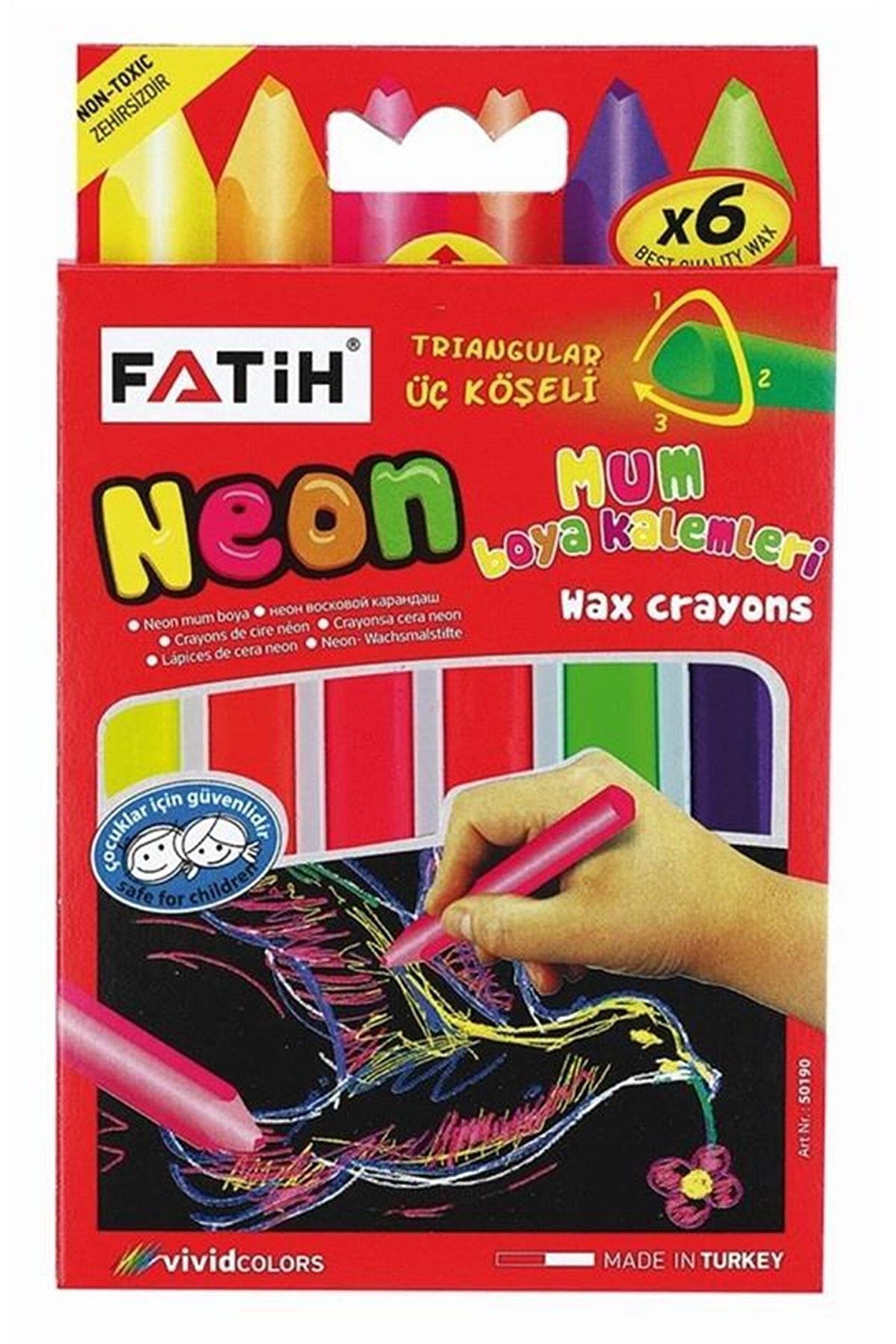 Fatih neon wax crayon 6 renk jumbo boya%300 esneme özelliği; ısıya dayanıklı; yıkanabilir; canlı renkli ve tam kapatıcı özelliği ile benzerlerinden farklıdır; El ısısında erimez; kolaylıkla ciltten ve kumaşlardan çıkabilir; güvenli malzemeden üretilmiş olup zararlı madde içermez; ;;