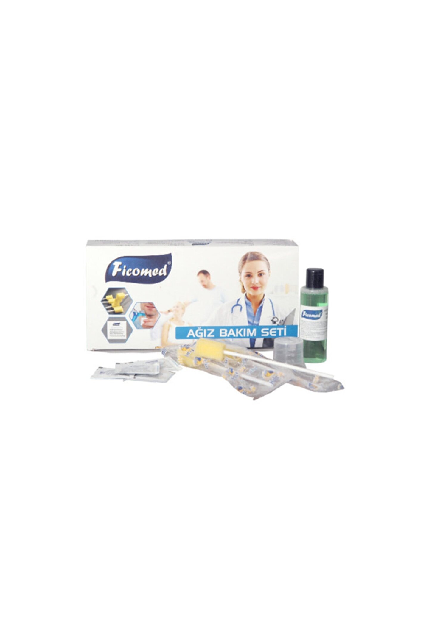 Ficomed ağız bakım seti kutulu ambalajda 20 li set Ficomed ağız bakım seti nedir;Ficomed ağız bakım seti yatarak tedavi gören hastalarda veya kendi bakımını yapamayan kişilerde ağız içi temizliğinde kullanılır;Ürün ağız içinde gelişen zararlı mikroorganizmaları yok eder;Özel formülü sayesinde ağız kuruluğunu engeller ve ağız içinde bulunan yaralardan kaynaklanan ağrıları hafifletir;Bu özellikleri sayesinde riskini azaltmaktadır;Ayrıca ficomed ağız bakım seti ağız içinde temizlik ve ferahlık sağlar;Bu ürün sadece yetişkinler içindir, bebeklerde kullanıma uygun değildir;Solüsyonun kimyasal içeriği Solüsyonun kimyasal içeriğinde deionized water, sorbitol, natural glycerin, polysorbate-20, sodium saccarine, sodium benzoate ve şavour bulunmaktadır;Jelin kimyasal içeriği Jelin kimyasal içeriğinde deionized water, hydroxy ethyl cellulose, glycerin, mint, citric acid, propyl paraben ve methyl paraben bulunmaktadır;Saklama koşulları 35°c’nin altında, güneş ışığından uzakta, serin bir yerde muhafaza edilmelidir;Kullanım şekli Bir miktar ağız temizleme solüsyonu kutu içindeki ölçü kabına konur;Ölçü kabındaki solüsyonun içine, ucunda sünger bulunan çubuk daldırılır ve süngere ağız temizleme solüsyonu emdirilir;Sonrasında tüm ağız boşluğu, diş etleri ve dil temizlenir;Bu işlemden sonra süngere bir miktar nemlendirici jel konur ve ağız boşluğuna sürülür;Bu temizleme ve bakım işlemi ağız içinin temiz, nemli ve ferah kalmasını sağlar;Günde 4 defa ağız temizliği ve bakımı yapılması önerilmektedir