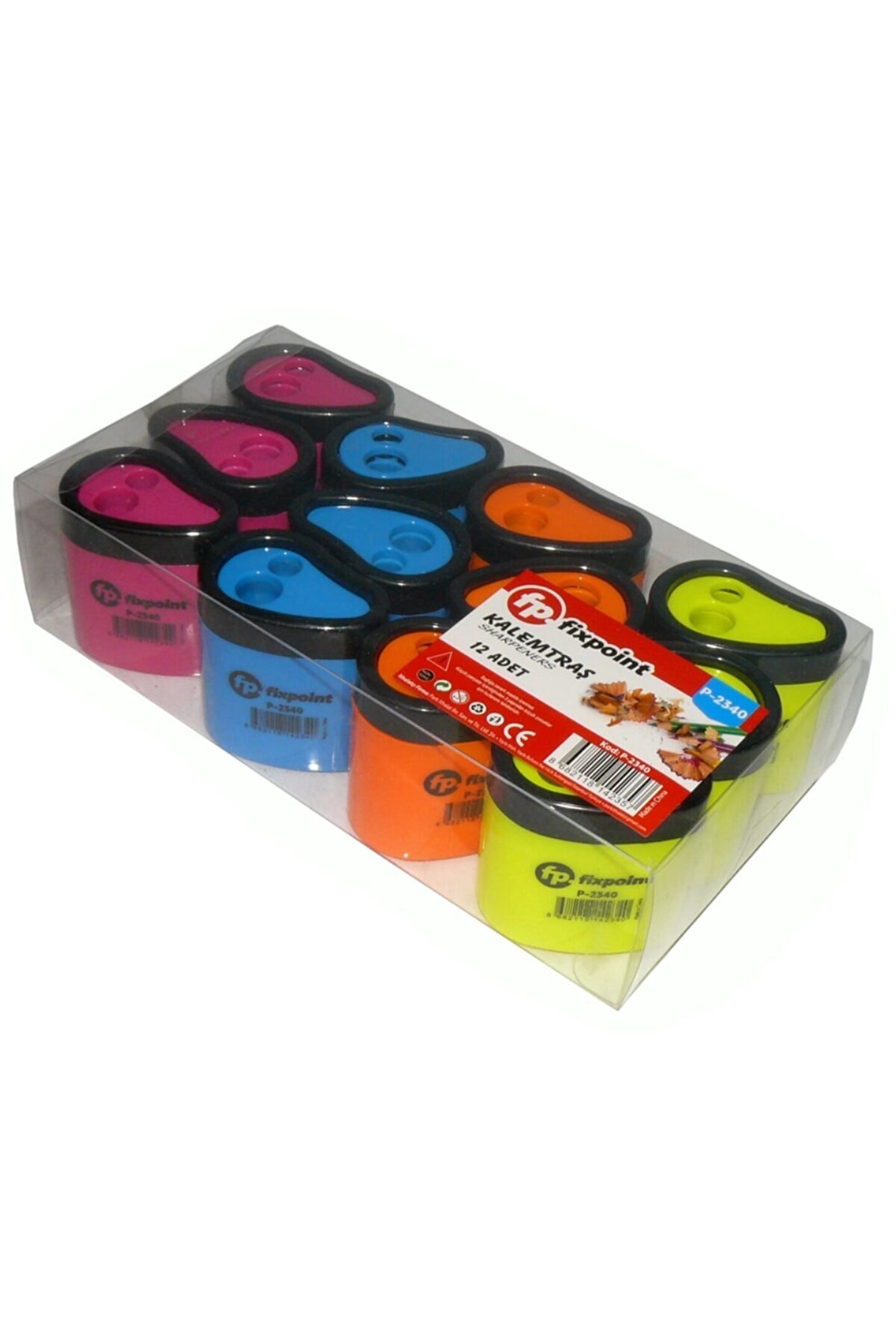 Çiftli kalemtraş fixpoint 12'li paket Güzel canlı renkler ve kaliteli bıçağa sahiptir ; Toplam 4 renktir; ( sarı, turuncu, mavi ve pembe ) ; 1 jumbo boy kurşun kalem 1 normal boy kurşun kalem girişi vardır; ; ;