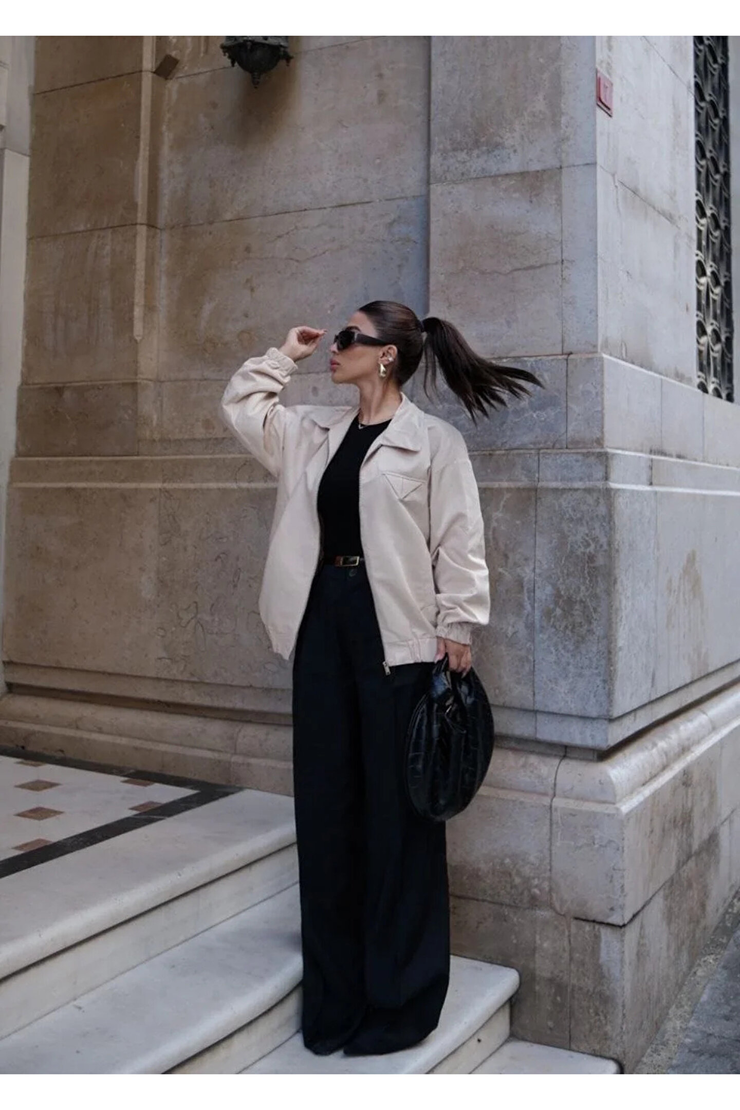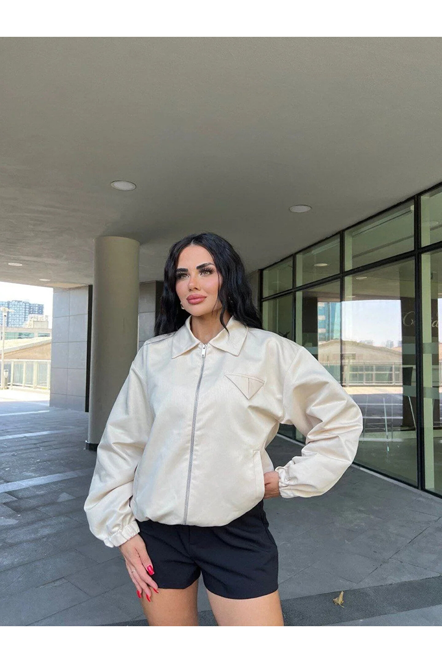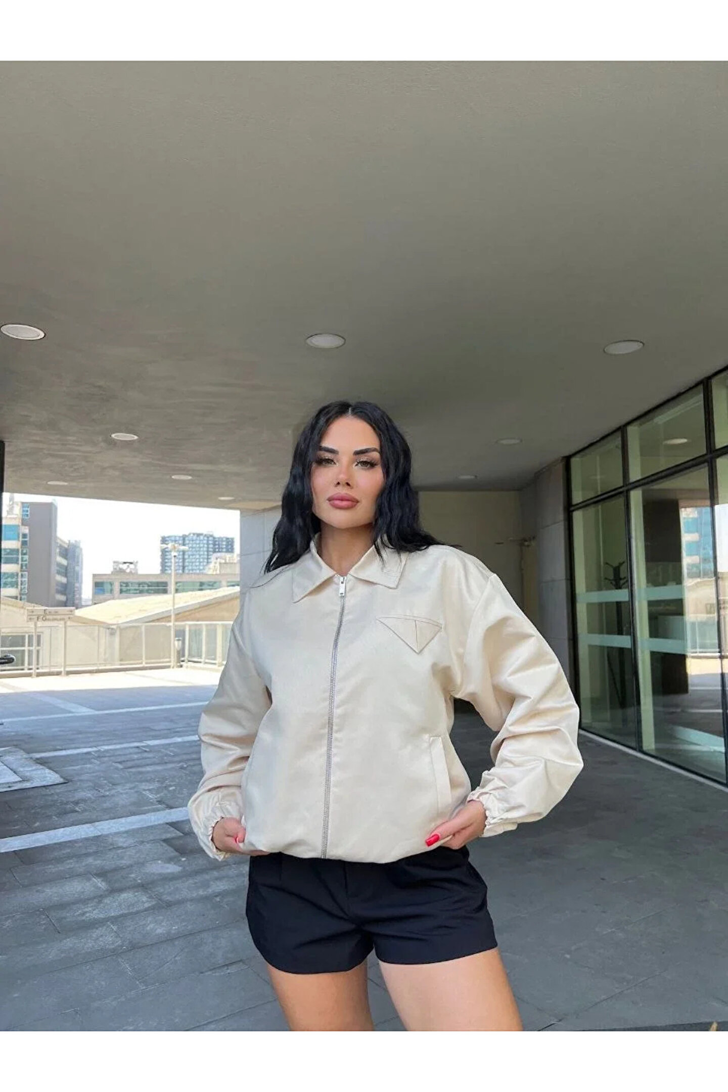 Flexium Fermuarlı Gömlek Yaka Bomber Ceket - Beyaz