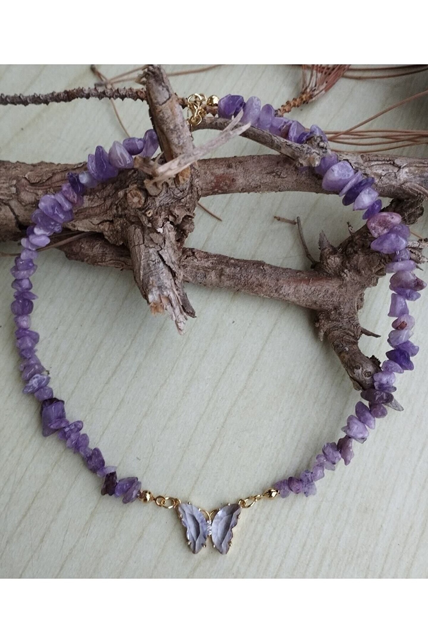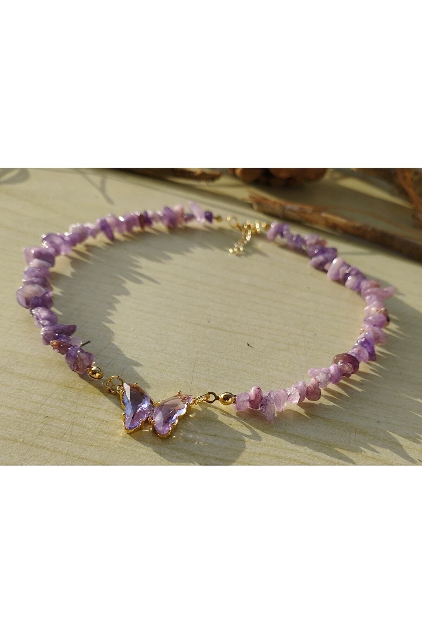 Doğal ametist taşı, negatif enerjiyi temizleyerek pozitifliği artırır.; Kristalin yapısı sayesinde stresi azaltmaya yardımcı olur ve zihinsel netliği artırır.; Kırılmış cam kelebek detayları, doğanın güzelliğini takınıza taşırken aynı zamanda zarafet katıyor.; Günlük kullanım için ideal olan bu kolye, şık ve modern tasarımıyla dikkat çeker.; Ametist taşı, ametist kelebek detayları ve kırık cam ile tasarlanmış bu kolye, benzersiz ve özgün bir takı seçeneği sunuyor.; Hem gündüz hem de gece şıklığınıza uyum sağlayacak şekilde tasarlanmıştır.; Özel günlerde veya günlük kullanım için mükemmel bir aksesuar olarak tercih edilebilir.; Doğal taşı koruma altına alarak uzun süreli kullanım imkanı sağlar.;