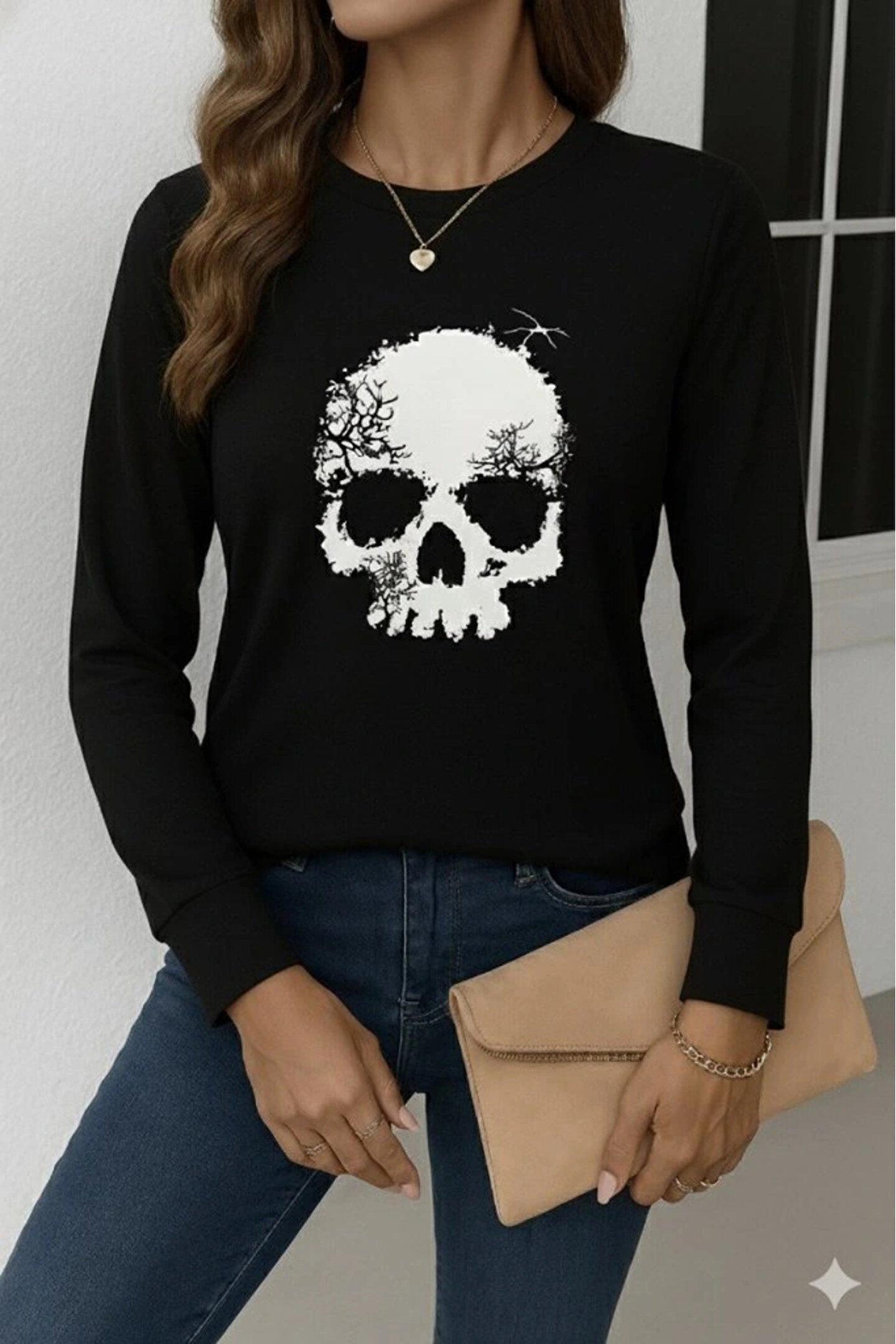 Kadın Uzun Kollu Bisiklet Yaka Kurukafa Desenli Viskon Bluz