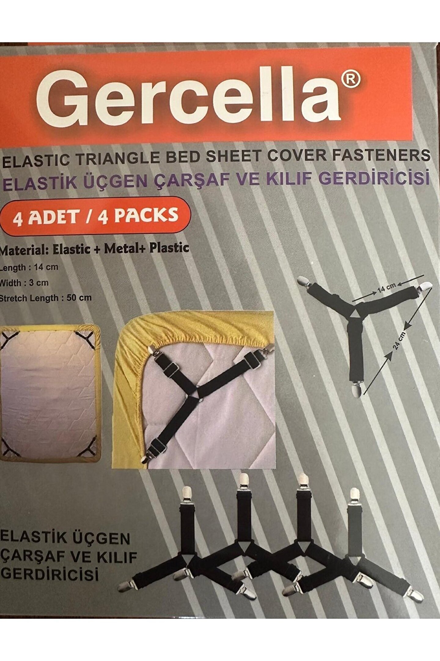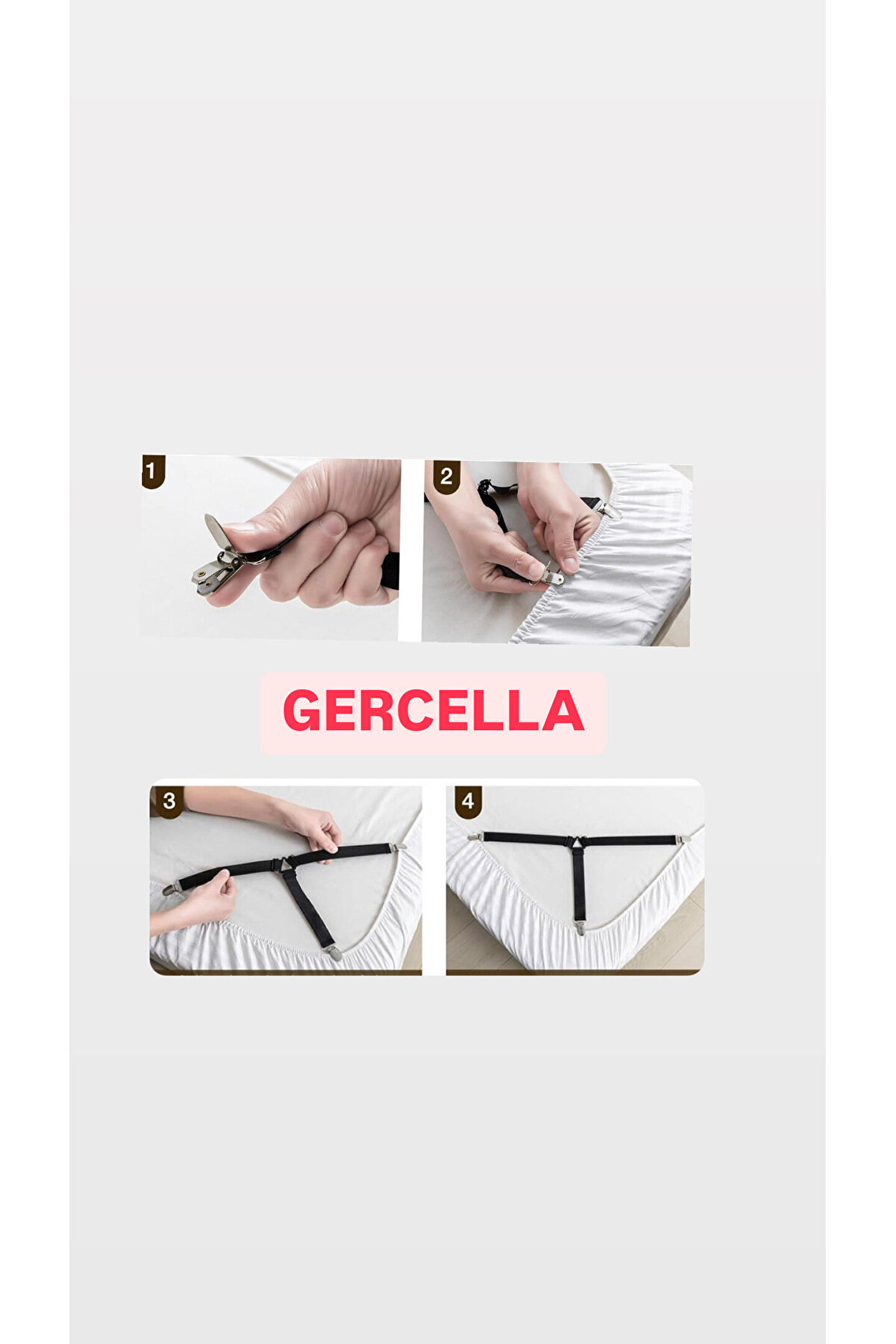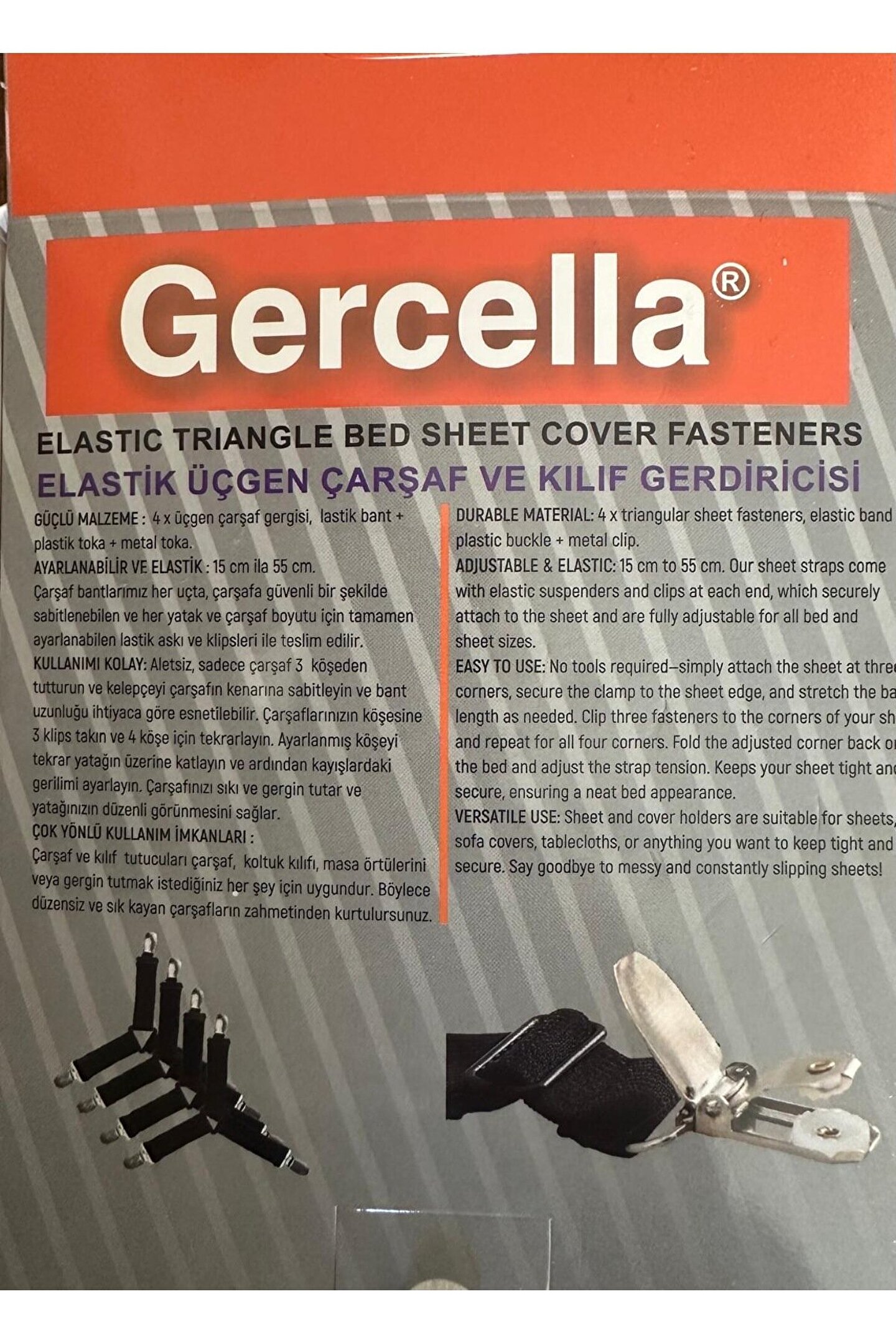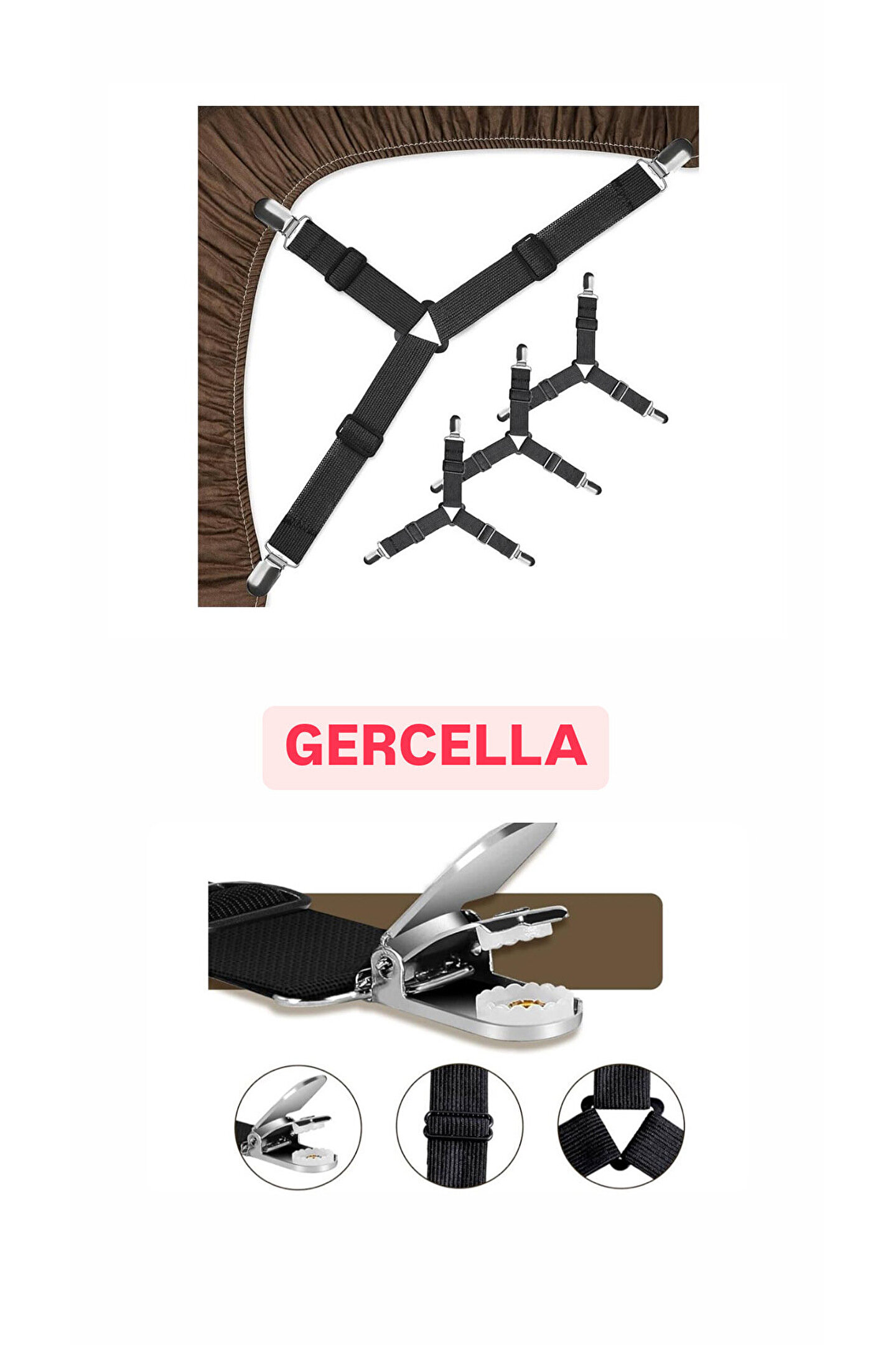 ****GÜÇLÜ MALZEME:4xÜÇGEN ÇARŞAF GERGİSİ,LASTİK BANT +PLASTİK TOKA,METAL TOKA ****AYARLANABİLİR VE ELASTİK:15 ila 55 cm.; ÇARŞAF BANTLARIMIZ HER UÇTA,ÇARŞAFA GÜVENLİ BİR ŞEKİLDE SABİTLENEBİLEN VE HER YATAK VE ÇARŞAF BOYUTU İÇİN TAMAMEN AYARLANABİLRN LASTİK ASKI VE KLİPSLERİ İLE TESLİM EDİLİR.; ****KULLANIMI KOLAY:ALETSİZ,SADECE ÇARŞAF 3 KÖŞEDEN TUTTURUN VE KELEPÇEYİ ÇARŞAFIN KENARINA SABİTLEYİN VE BANT UZUNLUĞU İHTİYACA GÖRE ESNETİLEBİLİR.; ÇARŞAFLARINIZIN 3KLİPS TAKIN VE4KÖŞE İÇİN TEKRARLAYIN.; AYARLANMIŞ KÖŞEYİ TEKRAR YATAĞIN ÜZERİNE KATLAYIN VE ARDINDAN KAYIŞLARDAKİ GERİLİMİ AYAR LAYIN ÇARŞAFINIZI SIKI VE GERGİN TUTAR; YATAĞINIZIN DÜZENLİ GÖRÜNMESİNİ SAĞLAR ****ÇOK YÖNLÜ KULLANIM İMKANLARI:ÇARŞAF VE KILIF TUTUCULARI ÇARŞAF, KOLTUK KILIFI,MASA ÖRTÜLERİNİ VEYA GERGİN TUTMAK İSTEDİĞİNİZ HERŞEY İÇİN UYGUNDUR.; BÖYLECE DÜZENSİZ VE SIK KAYAN ÇARŞAFLARIN ZAHMETİNDEN KURTULURSUNUZ