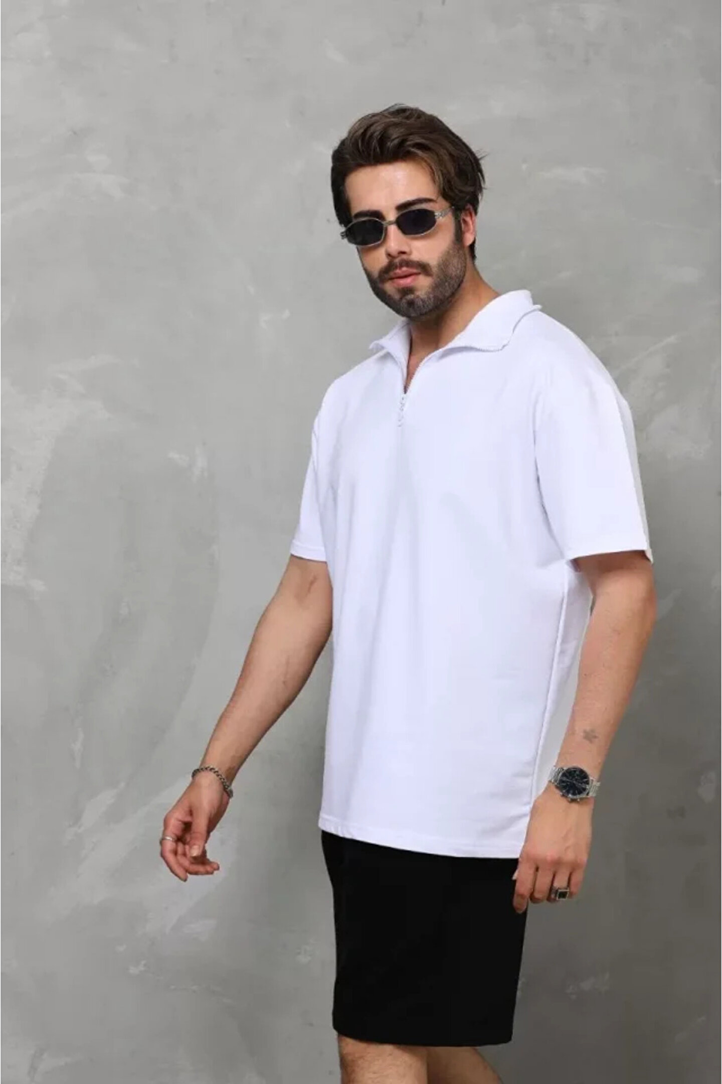 Unisex Yarım Fermuarlı Düz Oversize T-shirt - Beyaz