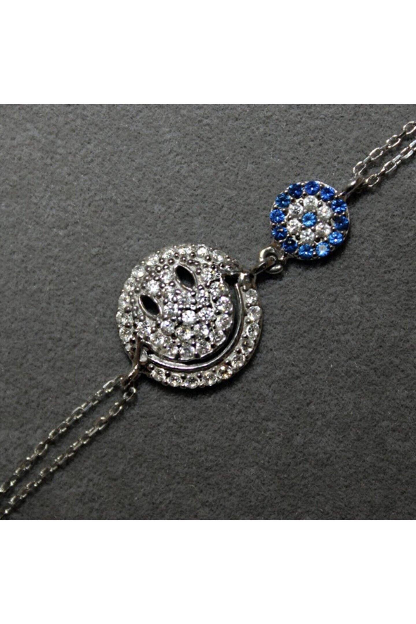 Göz alıcı zirkon taşlarla süslenmiş, şıklığınızı tamamlayacak bir aksesuar; Gülen yüz tasarımı ile neşeli ve pozitif bir görünüm sunar; Gümüş rengi, her türlü kıyafetle kolayca uyum sağlar ve zarif bir dokunuş katar; Zirkon taşların ışıltısı, bilekliğinize sofistike bir parlaklık kazandırır; Günlük kullanım için idealdir; hem rahatlığı hem de şıklığı bir arada sunar;