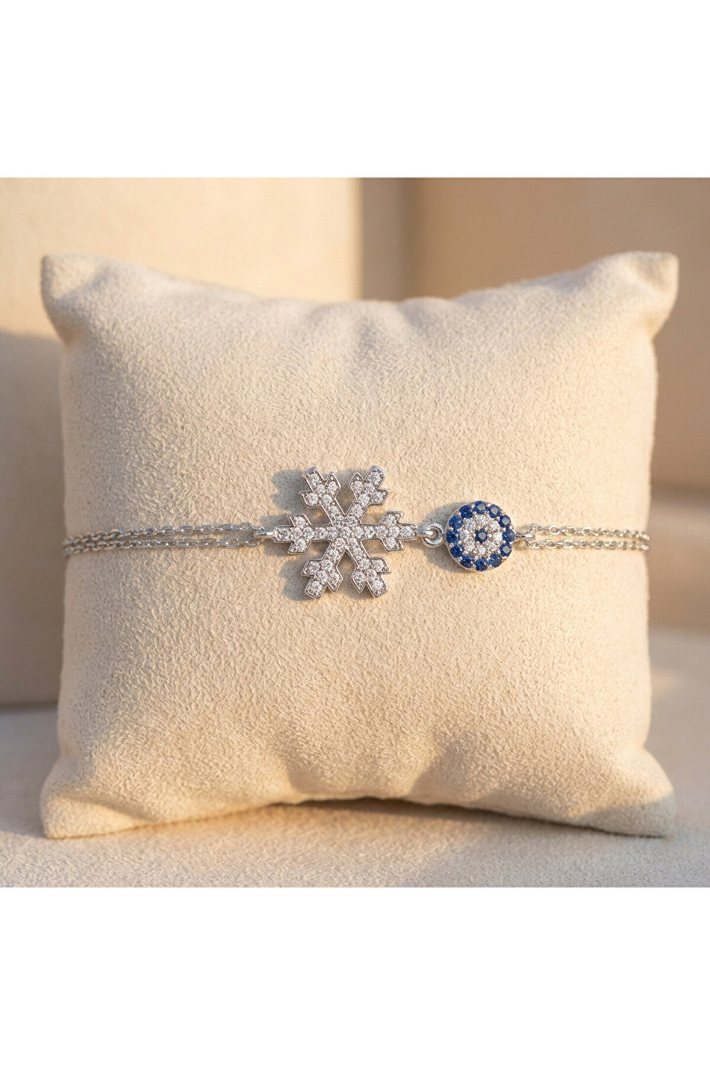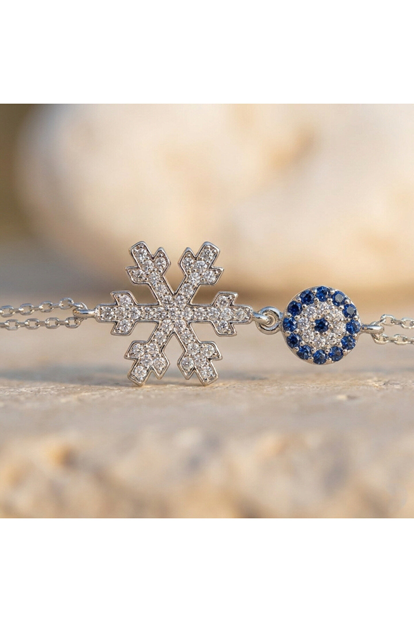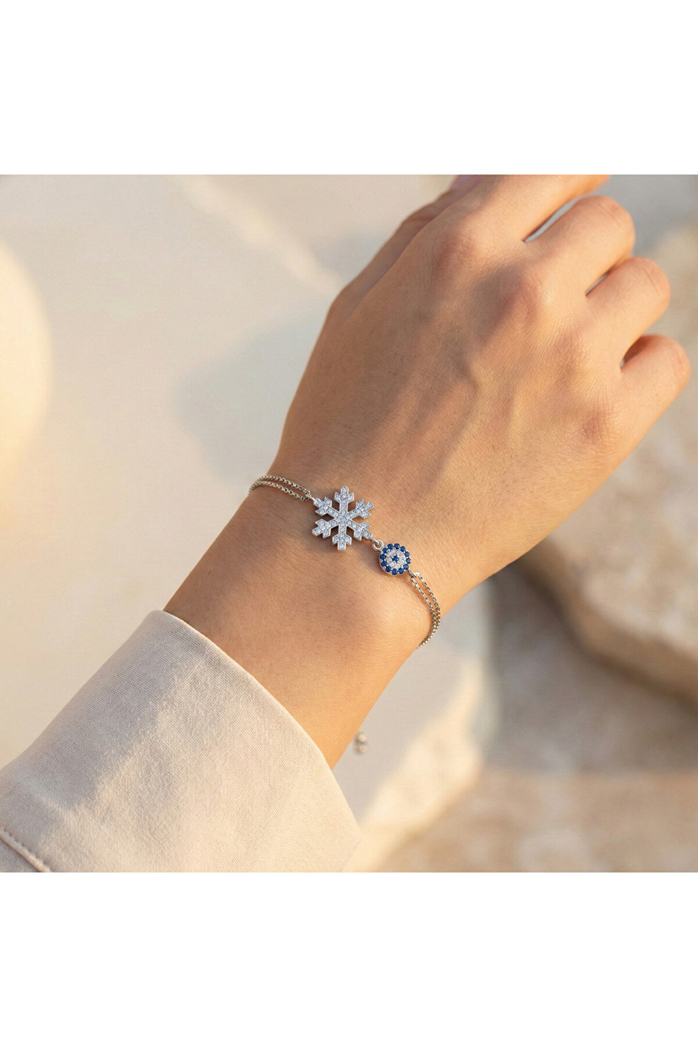 Zarif tasarımıyla dikkat çeken bu bileklik, gümüş rengin asaletini yansıtır; Zirkon taş detayları ile göz alıcı bir parlaklık sunar ve her türlü kıyafetle uyum sağlar; Özel günlerde veya günlük kullanım için ideal bir aksesuar seçeneği olarak öne çıkar; Kaliteli malzeme kullanımı sayesinde uzun süreli kullanım vaat eder.; Kar tanesi çapı 14.45 mm, nazarın çapı 6.80 mm.