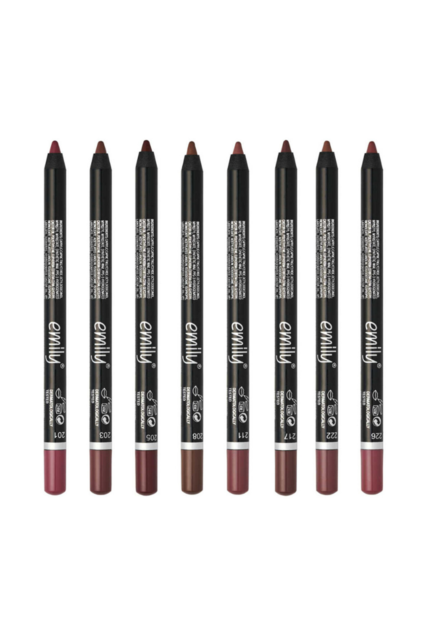 - Emily Dudak Kalemi 8'li Set, her dudak tonuna uygun renk seçenekleri sunar.; - No: 201'den No: 226'ya kadar geniş bir renk skalası ile dudaklarınızda farklı tonları keşfedin.; - Özel makyaj çantasıyla birlikte gelen bu set, günlük kullanım için idealdir.; - Erkul Kozmetik tarafından üretilmiş olup, Türkiye'de güvenle kullanabilirsiniz.; - Çok renkli tasarımıyla her makyaj stiline kolayca uyum sağlar.; - Kullanım talimatlarına uyarak uzun süreli kullanımın keyfini çıkarın.