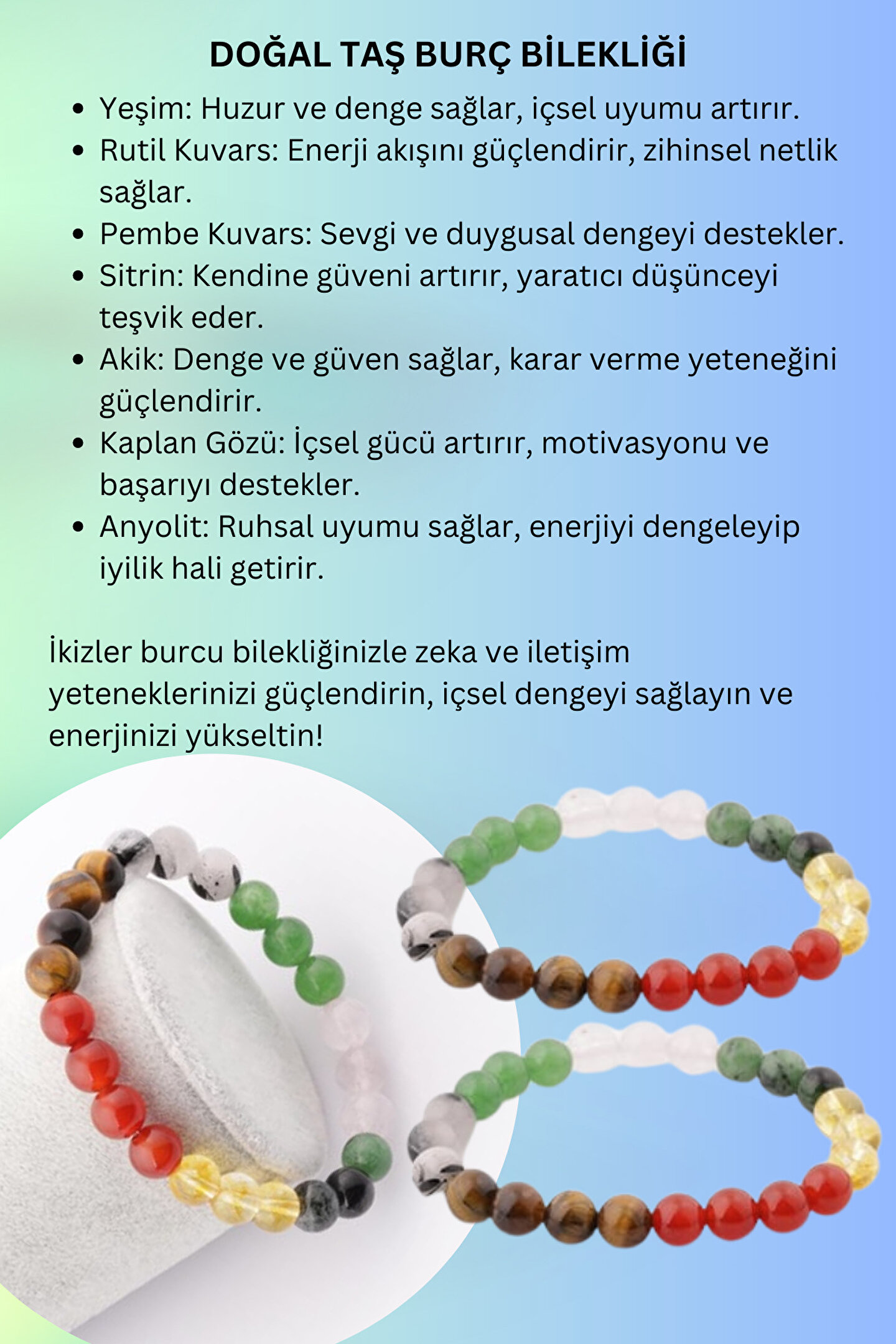 İkizler burcu taşlarından oluşan bu doğal taş bileklik, hem şıklığı hem de enerjik bir dokunuş sunar; Doğal taş kullanımı sayesinde her bileklik benzersiz ve otantik bir görünüm kazanır; İkizler burcu taşlarının enerjisiyle kişisel gelişimini destekleyen bu aksesuar, stilinizi tamamlar;