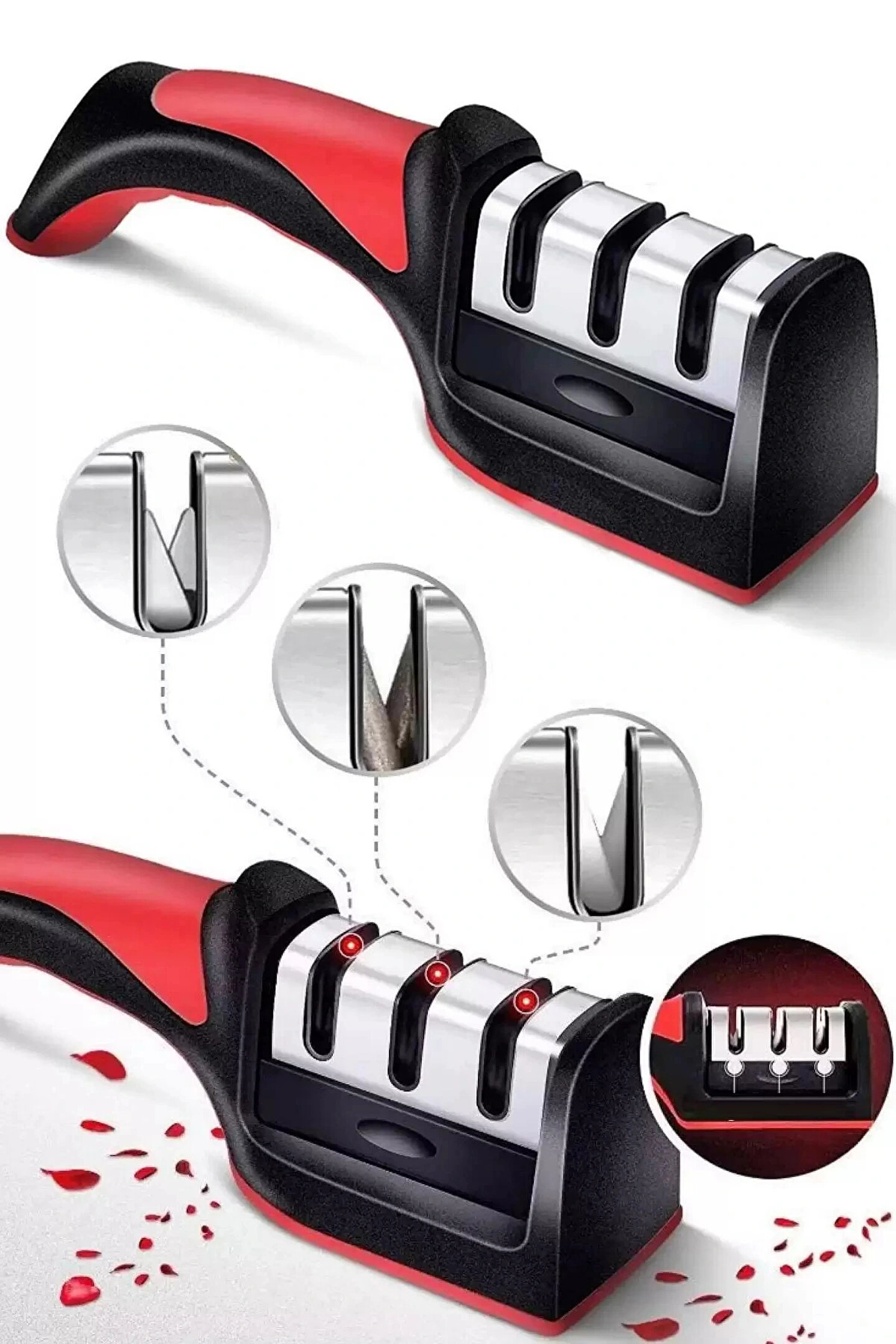 Mallame Profesyonel Tungsten Çelik Bıçak Bileme Aleti Mutfak Makası 3 Açılı Elmas Uçlu Bıçak Bileyici ; Dayanıklı ABS plastikten hazırlanmış, güçlü, dayanıklı ve uzun süre kullanmanıza olanak sunar. ; Kullanımı Kolay: İster sağ elinizi ister sol elinizi kullanabilirsiniz. ; Maksimum tutuş için ergonomik olarak rahat tutma kolu sayesinde bıçaklar bilenirken güvenli kullanım sağlar ; Bıçak bileyicinin uzun süreli kullanımı için dayanıklı ve yüksek kaliteli malzemeler kullanılarak üretilmiştir. ; Ergonomik şekilli tutamak ve kaymaz tasarım, bileyicinin kullanımını çok rahat hale getirir ; Elinizde taşınabilir taşlarla değerli bıçaklarınıza artık zarar vermeyin ; Hızlı, etkili bileme için bıçağı her bir yuvaya yerleştirin ve bıçağı birkaç kez yavaşça çekin. ; Mutfağınızda değerlendirebileceğiniz her nevi bıçak, makas, satır gibi kesici aletlerinizi bileyebilirsiniz. ; Bileme Kullanım ve Talimatları ; Kaba taşlama: Kör bıçaklar ; Seramik taşlama: Seramik bıçaklar ; İnce taşlama: El bıçakları ; 1. Bileme Yuvası: "seramik" aşaması (hazırlık) keskinleştirmeden önce hasarlı bıçakları ve düzleştirme bıçaklarını onarmak için kullanın ; 2. Bileme Yuvası: "kaba" aşaması (keskinleştirme) bıçağı keskinleştirir ve keskin uçlu "V" şekline gelmesini sağlar. ; 3. Bileme Yuvası: "ince" aşaması (ince ayar) bıçağı parlatır ve neden olabilecek herhangi bir yüzey düzensizliğini dengeler. ; Ürün Özellikleri ; Ürün Ağırlığı: 150 gr. ; Ürün Boyutu: 21cm x 5cm x 6.3cm ; Gövde Malzemesi: ABS Plastik, ; İç Malzemesi: 304 Paslanmaz çelik, ; Bileme Malzemesi: Elmas, Tungsten çelik ve seramik ; Renkler: Kırmızı, Siyah, Yeşil ; Not: İş bıçakları, tırtıklı bıçaklar için uygun değildir. ; Not: Bıçak bileyici bulaşık makinesinde yıkanması tavsiye edilmez elde yıkayın. ; Not: Çocukların erişemeyeceği yerlerde saklayın. ; Paket İçeriği: Satın aldığınız paket içerisinde 1 adet 3 açılı elmas uçlu bıçak bileyici bulunmaktadır. ;