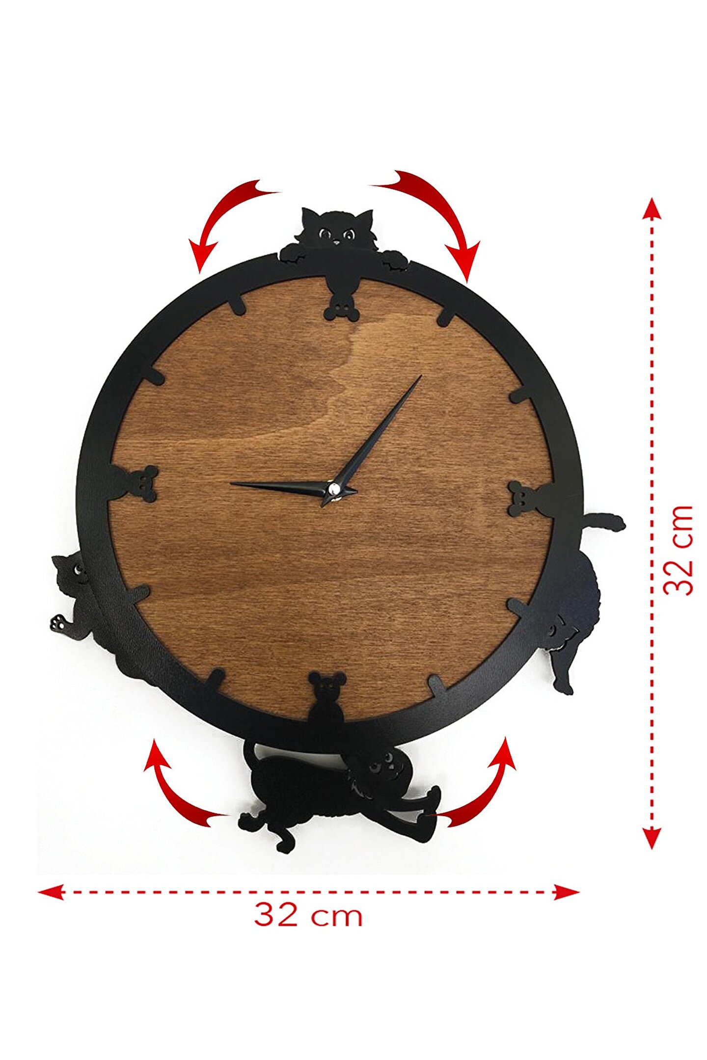 Goodtime dekoratif sallanır sarkaçlı kedi figürlü duvar saati ; Ürün özellikleri: ; - 1. Kalite Ahşap Mdf Malzemeden üretilmiştir. ; - Ürün tamamen el yapımıdır. (hand made) ; - 2 adet AA pil ile çalışır. ; - 1 adet pil, saati çalıştırır; diğer pil sarkacıhareket ettirir. ; - Her saniyede “Saat etrafındaki dört kedi”sağa solahareket eder. ; - Mekanizması yüksek kaliteli sessiz (quartz)çalışan akar saattir. ; - Saat üzerindeki akrep, yelkovan ve saniyemetal malzemedir. ; - Montaj şekli: Duvar çivisi ; - Montaja hazır özel askı aparatı ile bir çiviveya vidayla duvara kolayca sabitleyebilirsiniz. ; -Mutfak, oturma odası,çocuk odası,salon ve özel günlerinizde hediye olarak tercih edebileceğiniz dekoratif duvar saatidir. ; Ürün ebatları: ; Sarkaç DahilYükseklik: 32 cm ; Sarkaç DahilGenişlik : 32 cm ; Saat Gövde Çapı: 26 cm ; Derinlik : 6 cm ; Mdf Kalınlığı: 11 mm ;
