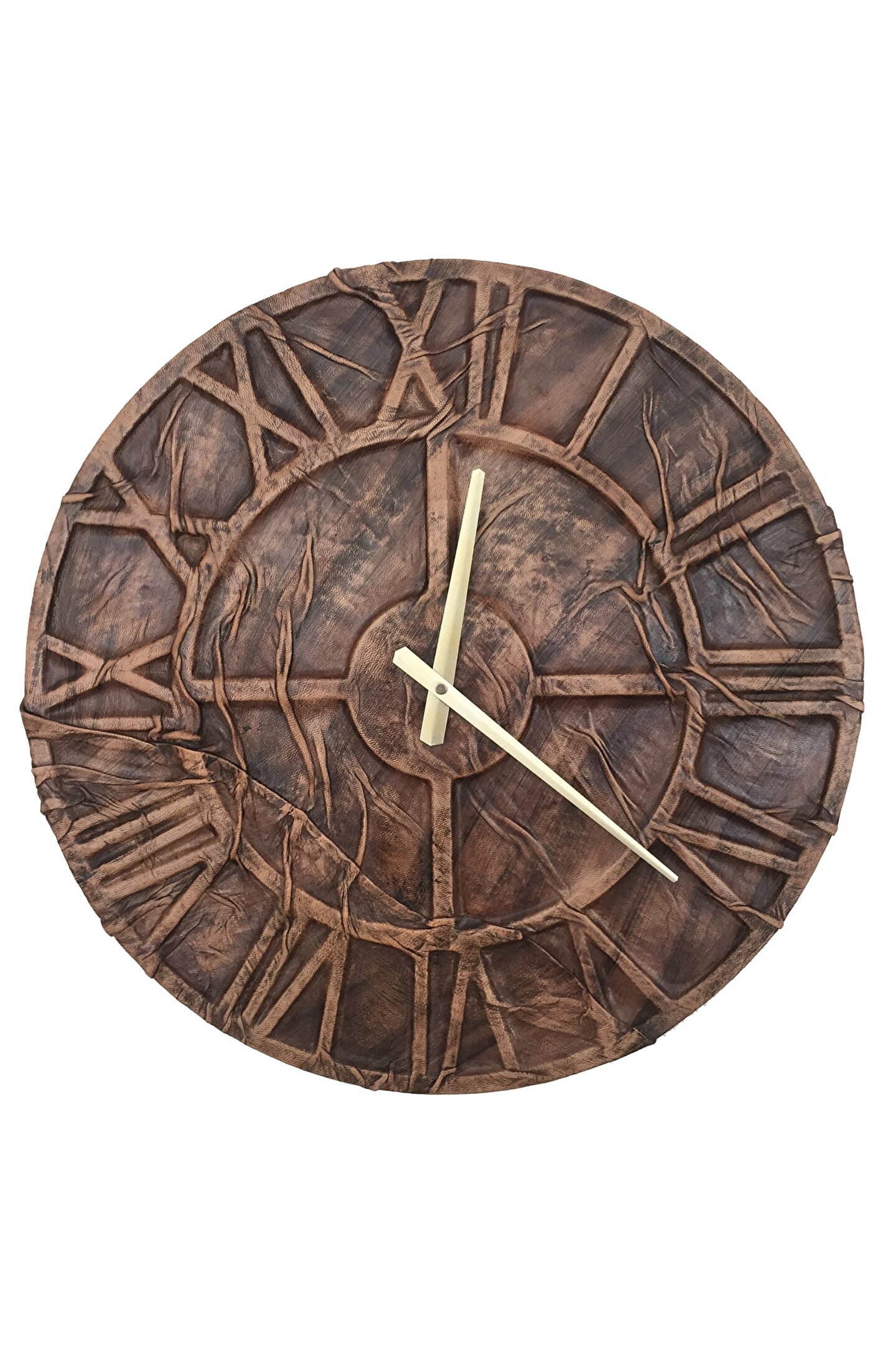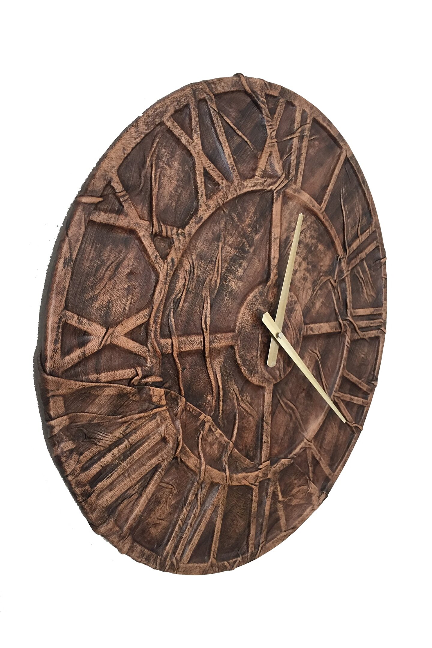 Goodtime El İşçiliği Dekoratif Eskitme Deri Duvar Saati ; Ürün özellikleri: ; - Gerçek sığır derisi ile kaplanmıştır. ; - Gövde kaplaması; deri büzdürme ve eskitme tekniği kullanılarak el işçiliğiile yapılmıştır. ; - Ürün tamamen el yapımı (hand made) ve el boyaması ile üretilmektedir. ; - Kaplama altı 1. Kalite Ahşap Mdf Malzemeden üretilmiştir. ; - 1 adet AA pil ile çalışır. ; - Mekanizması yüksek kaliteli sessiz (quartz) çalışan akar saattir. ; - Saat üzerindeki akrep ve yelkovan metal malzemedir. ; - Montaj şekli: Duvar çivisi- Montaja hazır özel askı aparatı ile bir çivi veya vidayla duvara kolayca sabitleyebilirsiniz. ; -Mutfak, oturma odası,çocuk odası,salon ve özel günlerinizde hediye olarak tercih edebileceğiniz dekoratif duvar saatidir. ; Ürün ebatları: ; Saat Çapı : 50 cm ; Derinlik : 8 cm ; Mdf Kalınlığı: 11 mm ;