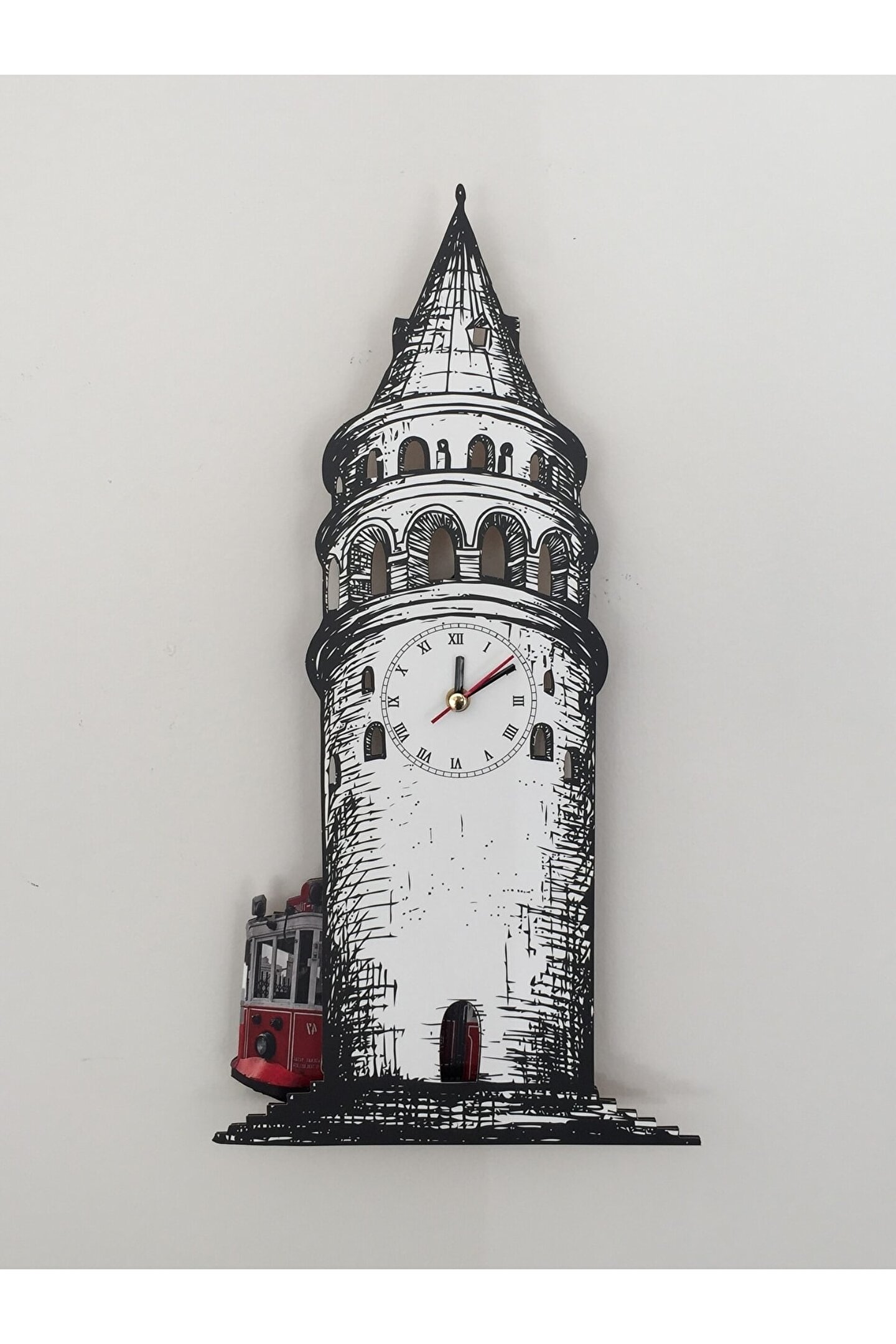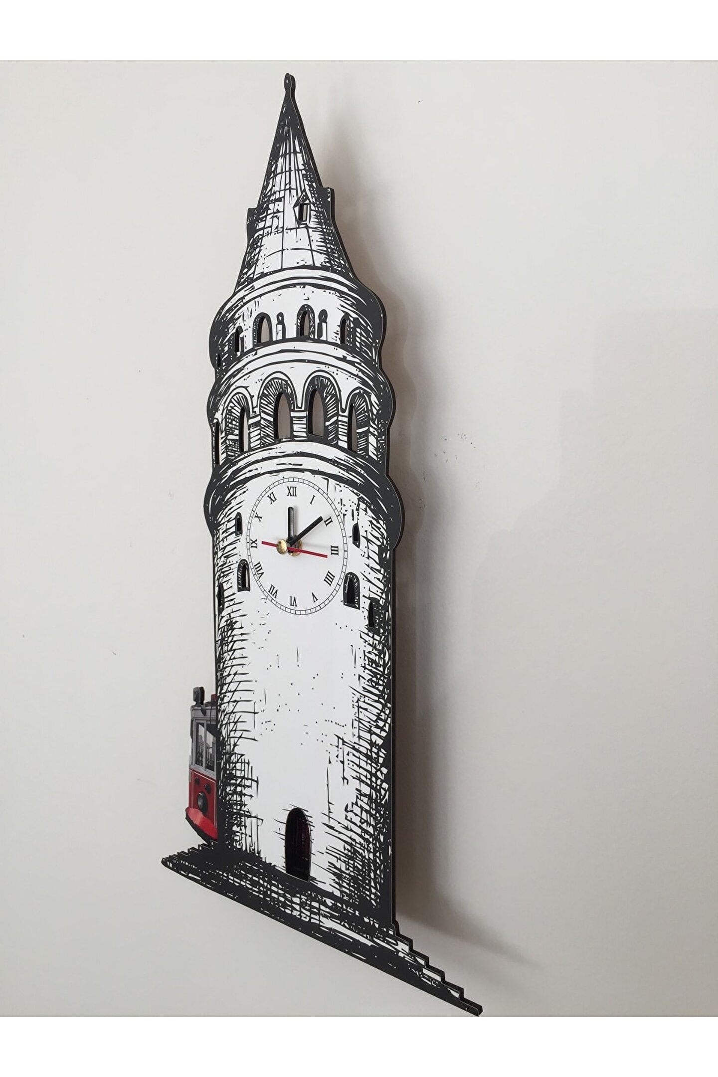Ayrıntılar Goodtime Galata Kulesi Dekoratif Sarkaçlı Duvar Saati Sallanır Sarkaçlıdır. ; Mdf Malzemeden Üretilmiştir. ; Mdf Kalınlığı: 4 mm 2 Adet AA pil ile çalışır. ; 1 adet pil saati çalıştırır, diğer pil sarkacı hareket ettirir. ; Her saniyede “Tramvay” sağa sola hareket eder. ; Ürünle birlikte pil gönderilmemektedir. ; Mekanizması sessiz çalışmaktadır. ; Kutusuyla gönderilmektedir. ; Kullanılan akrep yelkovan resme göre farklı renk ve desende olabilir. ; Ürün Görselinde Photoshop ya da Herhangi Bir Filtreleme Programı Kullanılmamıştır. ; Ürün Üzerindeki Akrep, Yelkovan ve Saniye Metal Malzemedir. ; Ürün Ebatları: Yükseklik : 46 cm Genişlik : 24 cm Derinlik : 4 cm;
