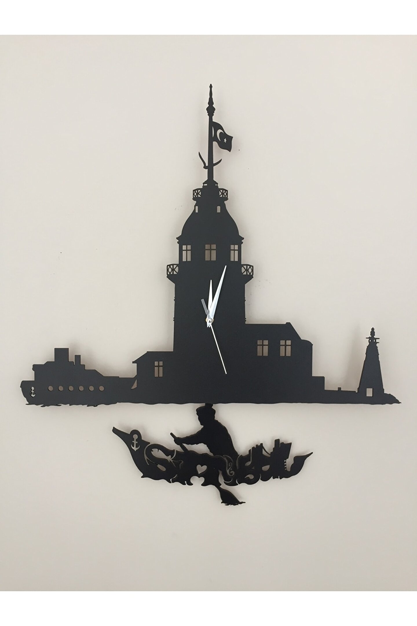 ; Goodtime Kız Kulesi Dekoratif Sarkaçlı Duvar Saati ; Lütfen taklitlerden kaçınınız. Saatin markası "goodtime" dır. ; Ürün özellikleri: ; - 1. Kalite Ahşap Mdf Malzemedenüretilmiştir. ; - Ürün tamamen el yapımıdır. (handmade) ; - 2 adet AA pil ile çalışır.- 1 adet pil, saati çalıştırır; diğer pilsarkacı hareket ettirir. ; - Her saniyede “İstanbul yazılı kayık”sağa sola hareket eder. ; - Mekanizması yüksek kaliteli sessiz(quartz) çalışan akar saattir. ; - Saat üzerindeki akrep, yelkovan vesaniye metal malzemedir. ; - Montaj şekli: Duvar çivisi ; - Montaja hazır özel askı aparatı ile birçivi veya vidayla duvara kolayca sabitleyebilirsiniz. ; -Mutfak, oturma odası,çocuk odası,salon ve özel günlerinizde hediye olarak tercih edebileceğiniz dekoratif duvar saatidir. ; Ürün ebatları: ; Sarkaç Dahil Yükseklik: 49 cm ; Genişlik : 27 cm ; Derinlik : 4 cm ; Mdf Kalınlığı: 3 mm ;