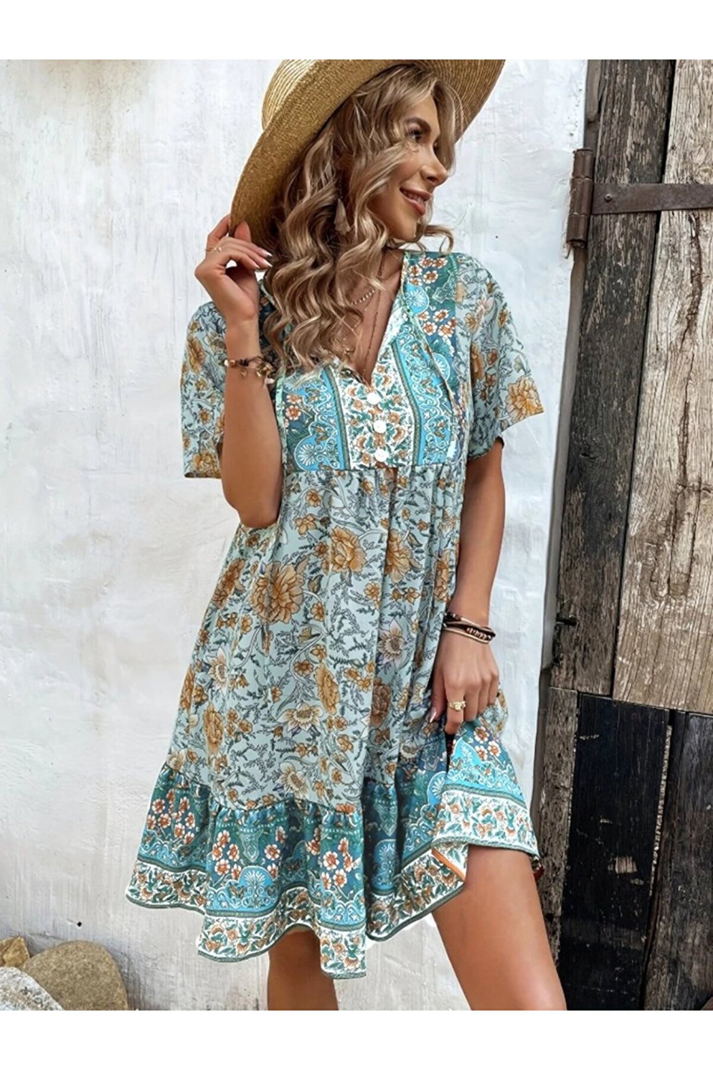 Kadın Kısa Kollu Yakası Bağcıklı önden Düğmeli Fırfır Desenli Süprem Elbise