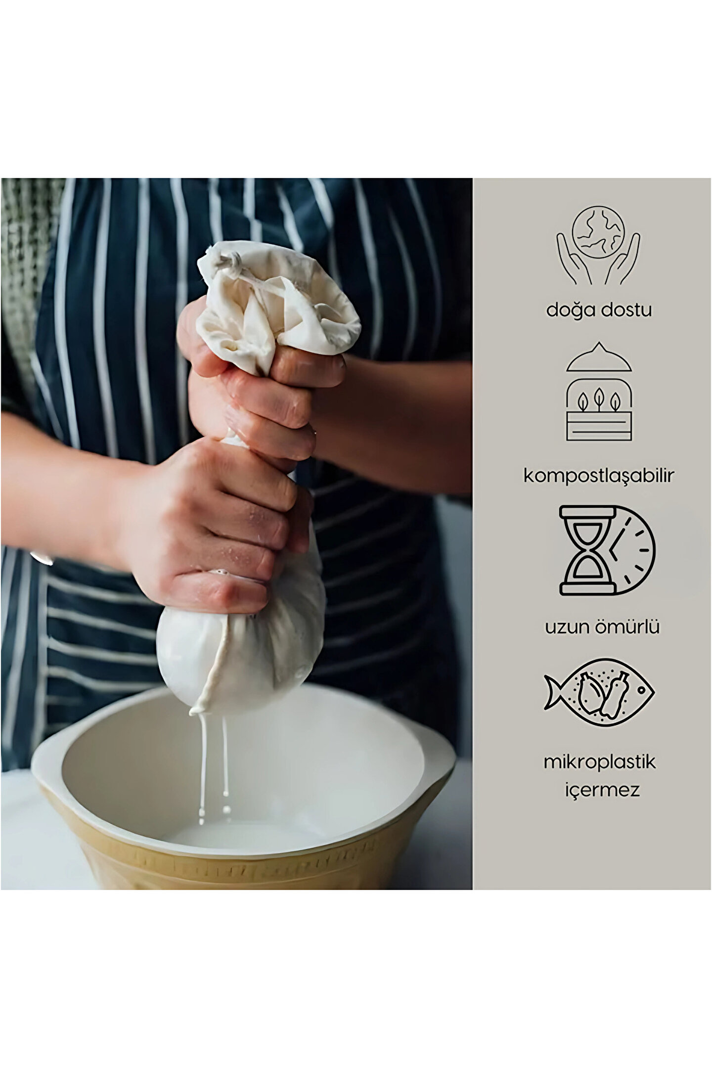 2 ADET TİR.; ; Natural %100 doğal Pamuktan üretilmiştir.; ; Peynir, yoğurt ve diğer süt ürünlerini süzmek için idaeldir.; ; Badem, meyve ve bütün vegan gıdalarını süzmek için idealdir.; ; Direkt gıda ile temas edilebilir.; ; Yıkanabilir tekrar kullanılabilir çevreye zarar vermez.; ; Sürekli gıda ile temas ettiği için doğal (kimyasal olmayan) temizleyici ile yıkamanız tavsiye edilir.; ; Ebatları: 20 (en) x 25 (boy) cm.; ; Organik pamuktan üretilmiş olup, doğal ve sağlıklı bir kullanım sunar.; ; özellikle yoğurt, peynir ve sebzeler gibi malzemelerin hazırlanmasında pratiklik sağlar.; ; - Çok amaçlı kullanımı sayesinde mutfakta yer kaplamaz ve kolayca saklanabilir.; ; - Menşei Türkiye'den gelen bu ürünler, yerel kaynakların desteklenmesine katkıda bulunurken aynı zamanda kalite standartlarına uygun olarak üretilmiştir.