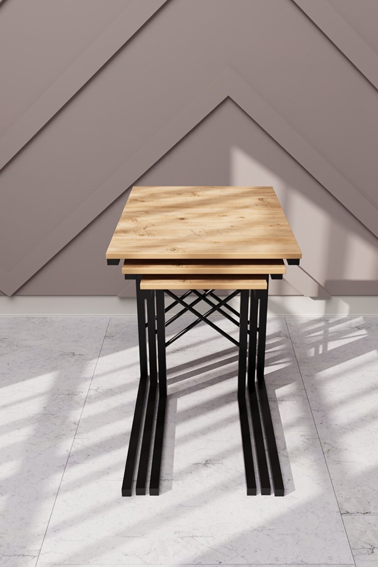 3'lü zigon sehpa seti, dekoratif açıdan da büyük bir avantaj sunar. Çam renginin sıcaklığı ve metalin modernliği ile tasarlanmış bu sehpalar, her türlü iç mekan dekorasyonuna uyum sağlar ve estetik bir bütünlük oluşturur. Dekorasyon tarzınız ne olursa olsun, bu zigon sehpa seti evinize şıklık katacak ve misafirlerinizi etkileyecektir.