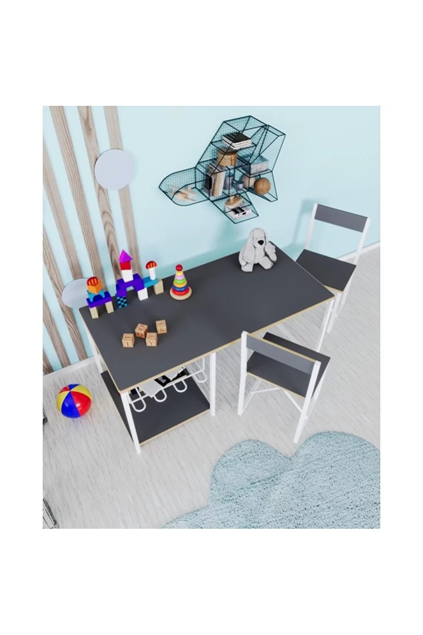 Çocuklar için tasarlanan bu çocuk çalışma masası ve 2 sandalyeli oyun etkinlik aktivite masası, konfor ve ergonomiyi ön planda tutarak, minik kullanıcılarının rahat etmesini sağlıyor. Çocuk çalışma masası altındaki tel raf ise, düzenli bir saklama alanı olarak kullanılıyor, böylece çocuklar çizim kağıtları ve kırtasiye malzemelerini kolayca düzenleyebiliyorlar.
