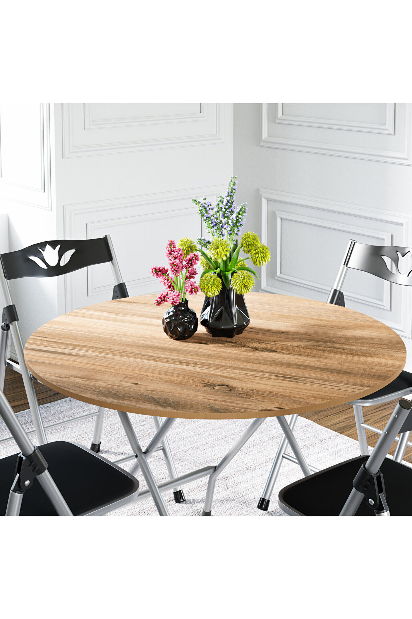 Katlanır Masa Yuvarlak Kırma Mutfak Masası, modern ve işlevsel bir mobilyadır. Bu set, özellikle küçük mutfaklar, yemek odaları veya çok amaçlı alanlar için tasarlanmıştır. 70 çap boyutlarındaki masa, ideal bir yemek yüzeyi sunarken, katlanabilir sandalyeler alanı en verimli şekilde kullanmanıza olanak tanır. Setin tasarımında, Atlantik Çam'ın doğal dokusu ve MDF, görsel bir zenginlik ve modern bir dokunuş ekler. Masa ve sandalyeler, elektrostatik boyalı metal ayaklar sayesinde ekstra sağlamlık kazanır. Bu yapı, günlük kullanıma uygun dayanıklılık sunarken, şık bir görünümle mekanınızı güzelleştirir. Katlanabilir masa ve sandalyeler, küçük yaşam alanlarında büyük bir avantaj sağlar. Setin kolay katlanabilir olması, sınırlı depolama alanlarında bile rahatlıkla saklanabilmesine imkan verir. Bu özellik, özellikle apartman dairesi gibi yerlerde yaşayanlar için idealdir, kullanılmadığı zamanlarda masa ve sandalyeleri kolayca kaldırıp alan açabilirsiniz. Set, fonksiyonelliği ve şıklığı bir arada sunarak, her türlü iç mekan dekorasyonuna uyum sağlayacak şekilde tasarlanmıştır.