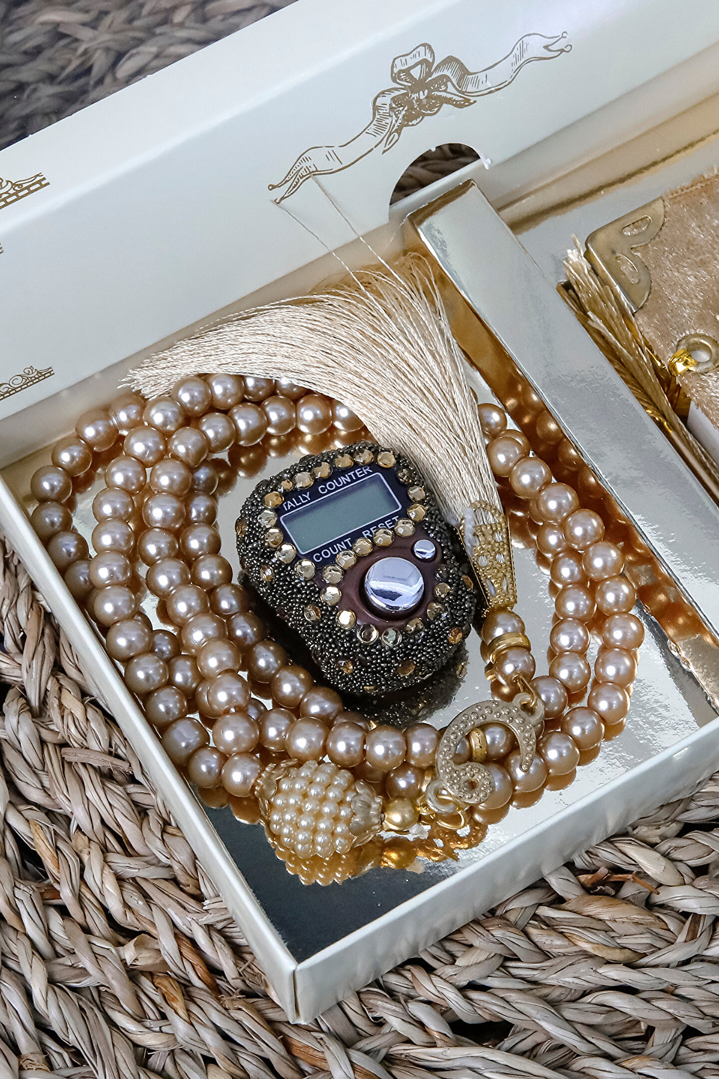 Hac Umre Hediyelik 10 Adet - Taşlı Zikirmatik Tesbihmatik Kadife Kaplı Mini Kuran 99lu İnci Tesbih Seti