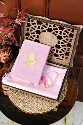 Ahşap Hediyelik Kuran Kutusu - Lüks Kuran Okuma Sehpası - Rahleli Kuran Seti ? Dekoratif Kuran Kutusu Setimiz, Hafız Osman Hattı Kadife Kaplı Kur'an-ı Kerim, Seccade ve 99'lu İnci Tesbihden oluşan eşsiz seti içeriyor. Kuranınızı dekoratif kabında saklayan kutu; mekanizması sayesinde dilendiğinde okuma standı/rahleye dönüşebiliyor. Ürün Özellikleri: Ahşap Rahle Mekanizmalı Kutu: 37x28x8,5 cm Orta Boy Kuranı Kerim, 99'lu Vav Harfli İnci Tesbih Goblen Simli Seccade: 100x65 cm