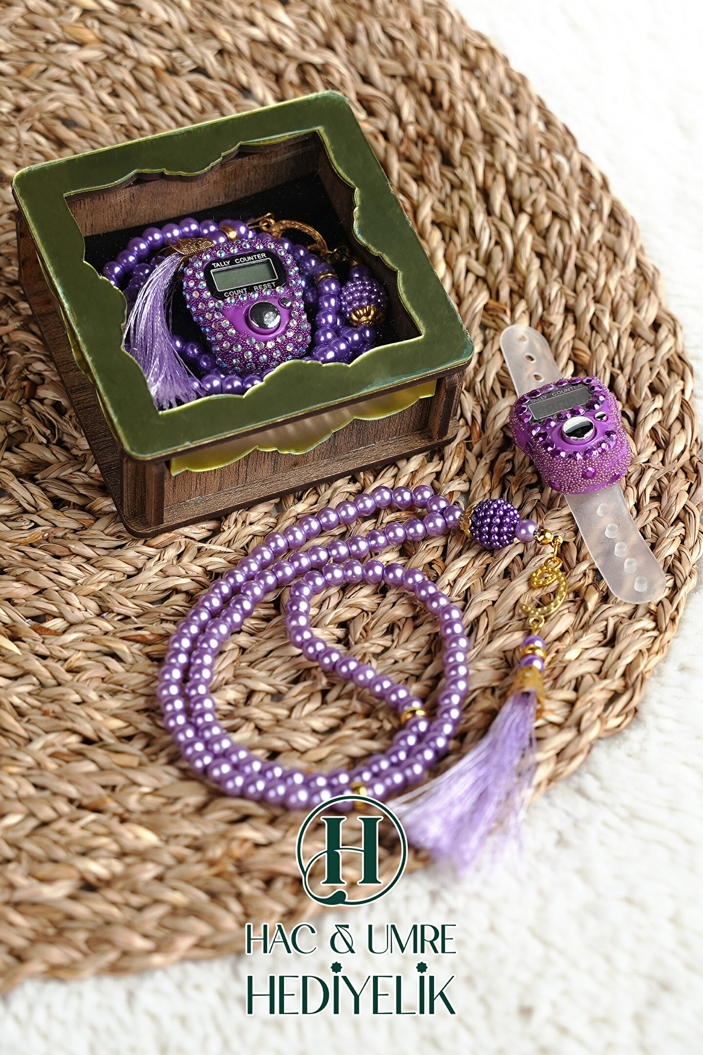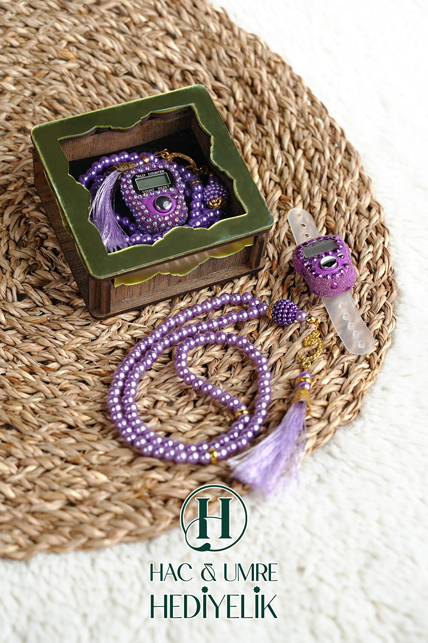 Hac Umre Hediyelik Hediyelik Tesbih Seti | Ahşap Kutulu Elektronik Tesbih ve 99lu İnci Tespih | Özel Gün Hediyesi