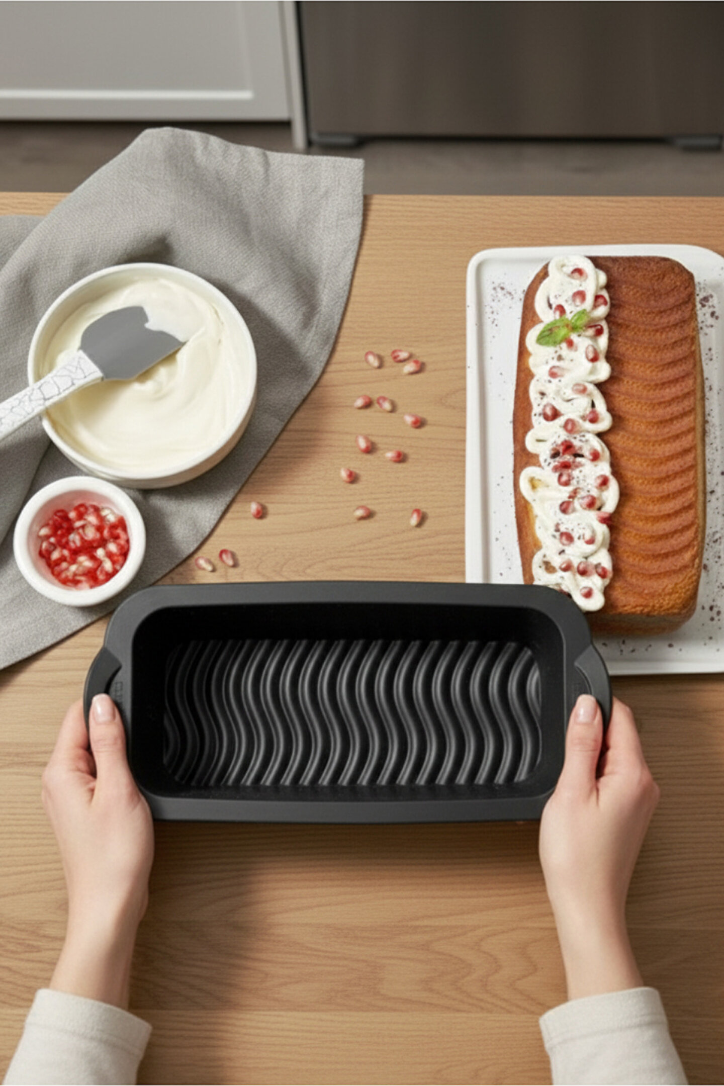 Silikon Baton Kek Kalıbı; baton kek, ekmek keki, mozaik kek ve tuzlu kek tarifleri için ideal kullanım sunar; yüksek kaliteli ve esnek silikon yapısı sayesinde kekler kalıba yapışmadan kolayca çıkarılır; iç yüzeyindeki dalgalı özel desen sayesinde keklere şık ve profesyonel bir görünüm kazandırır; fırında yüksek ısıya dayanıklı silikon malzemeden üretilmiştir, formunu korur ve uzun ömürlü kullanım sağlar; esnek yapısı sayesinde dolapta az yer kaplar ve saklaması pratiktir; homojen ısı dağılımı ile keklerin her noktasının eşit pişmesine yardımcı olur; elde yıkamaya ve pratik temizliğe uygundur, koku ve leke tutmaz; mutfakta hem günlük kullanım hem de özel sunumlar için şık ve fonksiyonel bir çözümdür; ev kullanımı, hobi mutfakları ve profesyonel mutfaklar için uygundur.