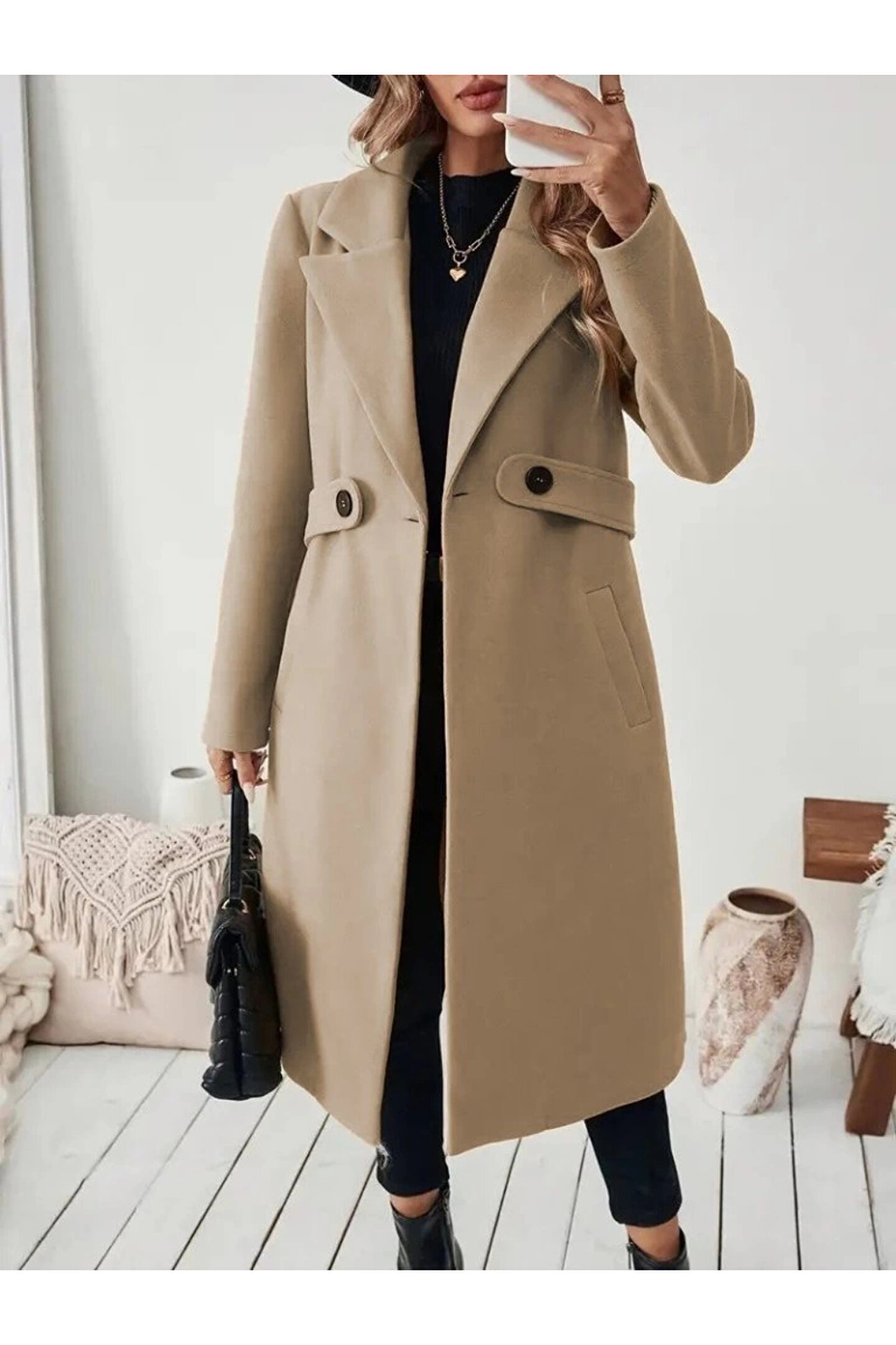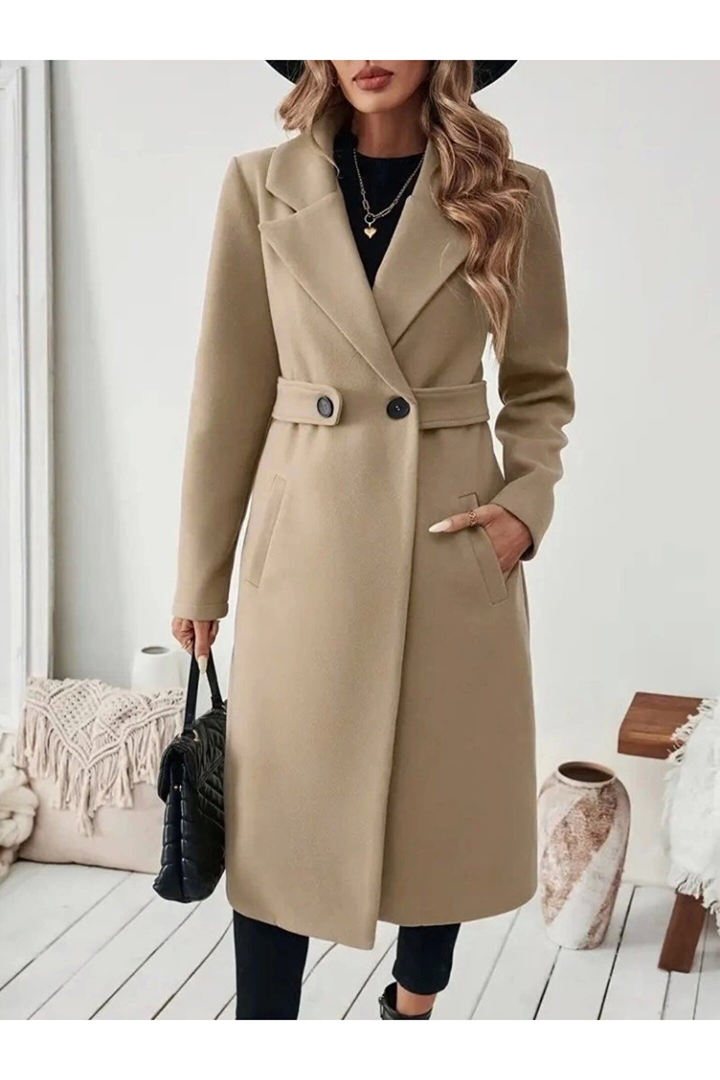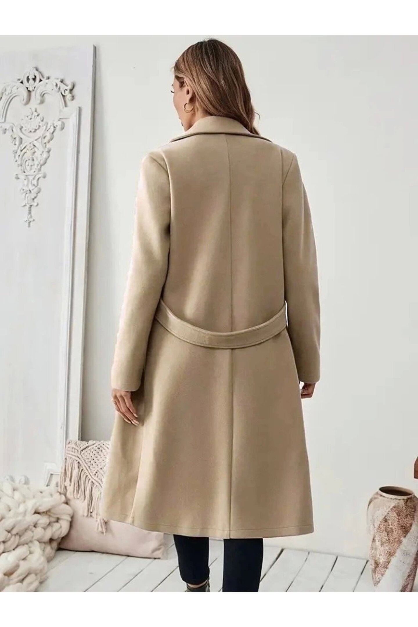 HanZone Kadın Uzun Kollu Yakalı Belde şerit Düğme Detaylı Cepli Mini Kaşe Kaban