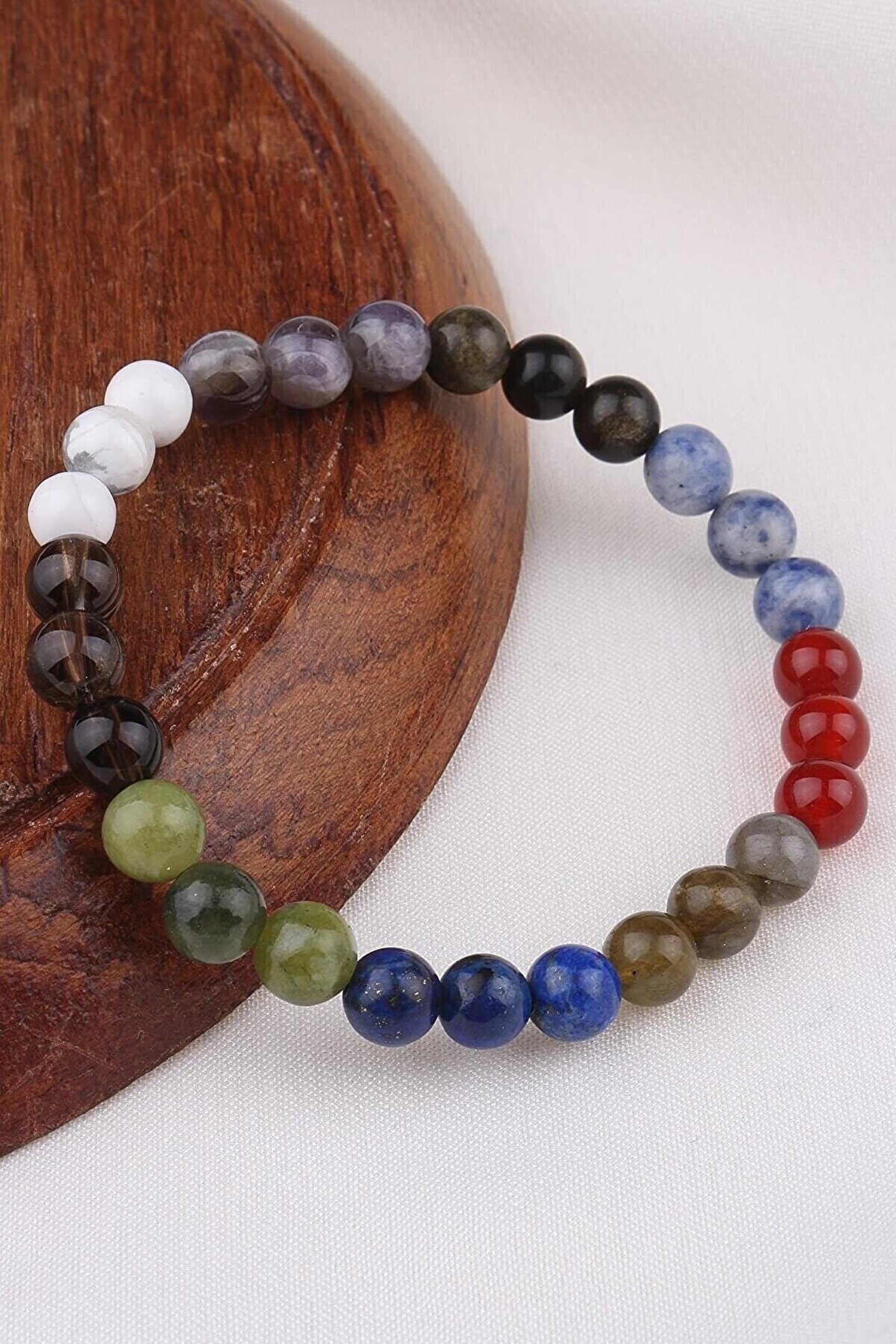 Özel Tasarım Doğal Taş Bileklik Ürünlerimiz gerçek doğal taştır.; Sertifikasıyla birlikte gönderilir.; Bileklikte Kullanılan Taşlar Ametist Havlit Akik Sodalit Yeşim Dumanlı Kuvars Labradorit Obsidyen