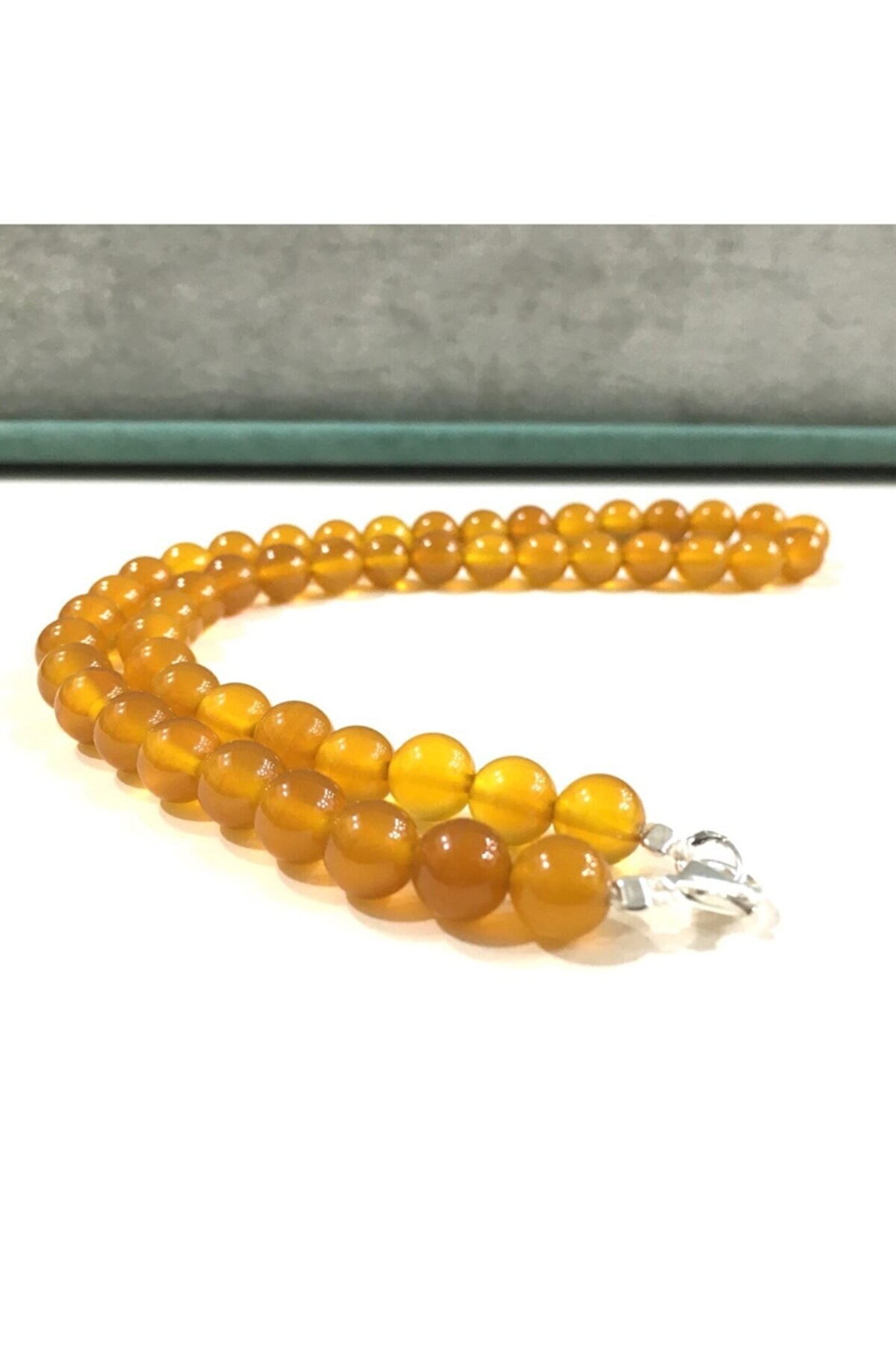 - Doğal sarı akik taşı, her bir kolye parçasında benzersiz bir güzellik sunar ve doğanın zarafetini yansıtır; - Gümüş materyal kullanımı, hem şıklığı hem de dayanıklılığı bir arada sunarak uzun süreli kullanım imkanı sağlar; - Gümüş klips detayı, kolyenin modern ve sofistike bir görünüm kazanmasına katkıda bulunurken, aynı zamanda kolay takma ve çıkarma olanağı sunar;