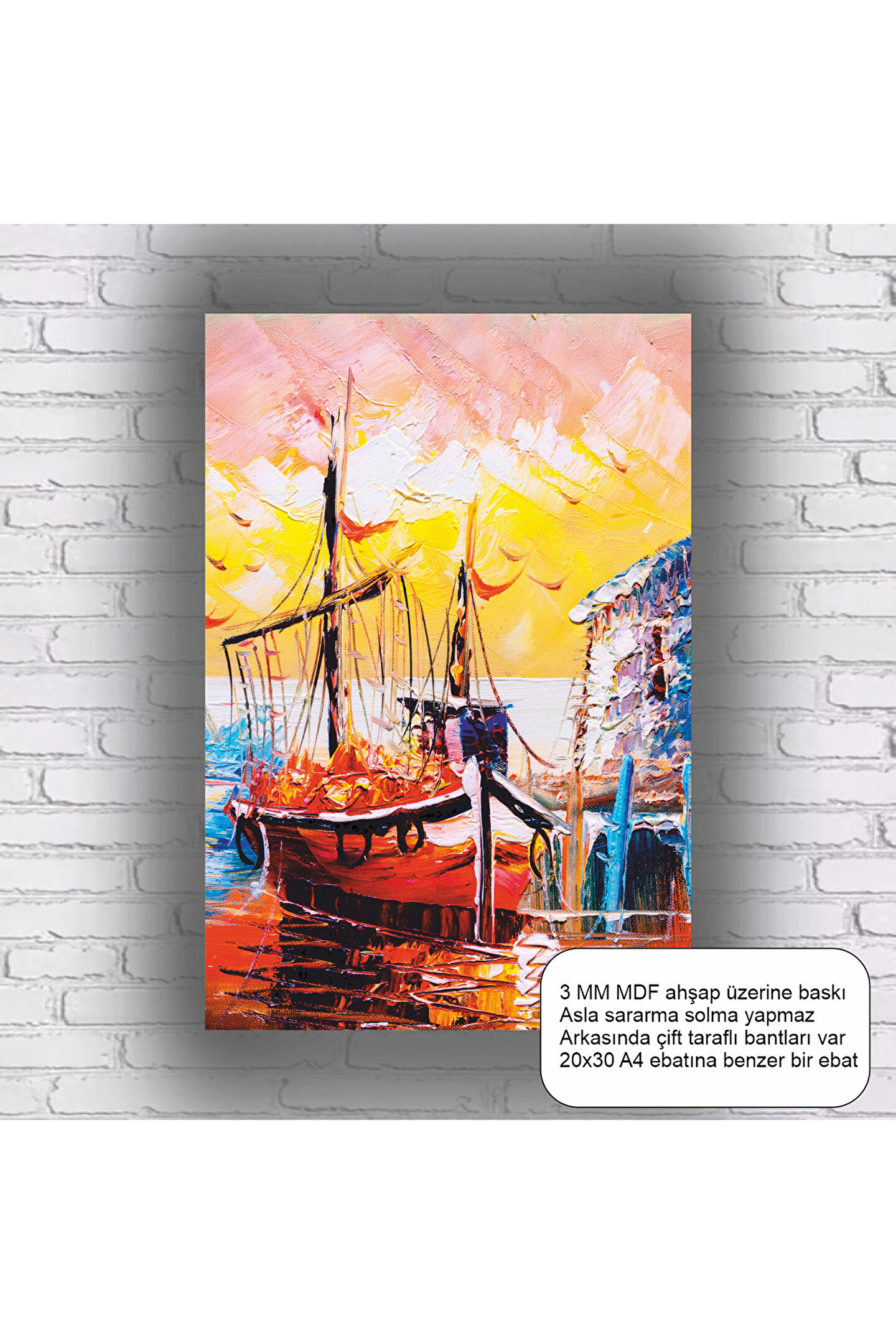 - Doğa severlerin vazgeçilmezi, denizdeki balıkçı teknesi martılar temalı sanat eseri.; - Türkiye'de üretilmiş, yerel sanatçılarımızın özgün dokunuşlarını taşıyan bir ürün.; - Çerçevesiz tasarımı sayesinde mekanınıza kolayca uyum sağlar ve farklı çerçeve seçenekleriyle kişiselleştirilebilir.; - Yüksek kaliteli MDF materyal kullanımı, uzun ömürlü ve dayanıklı bir kullanım sunar.;