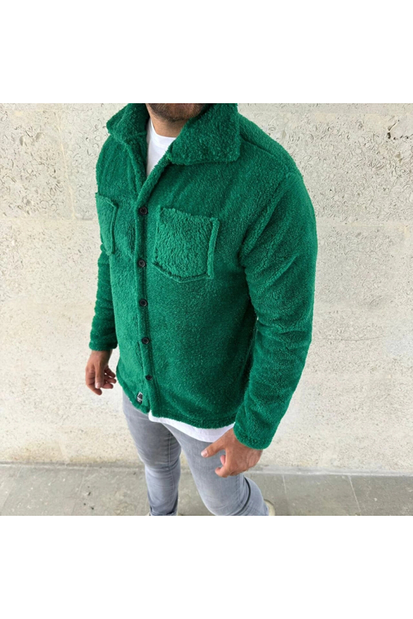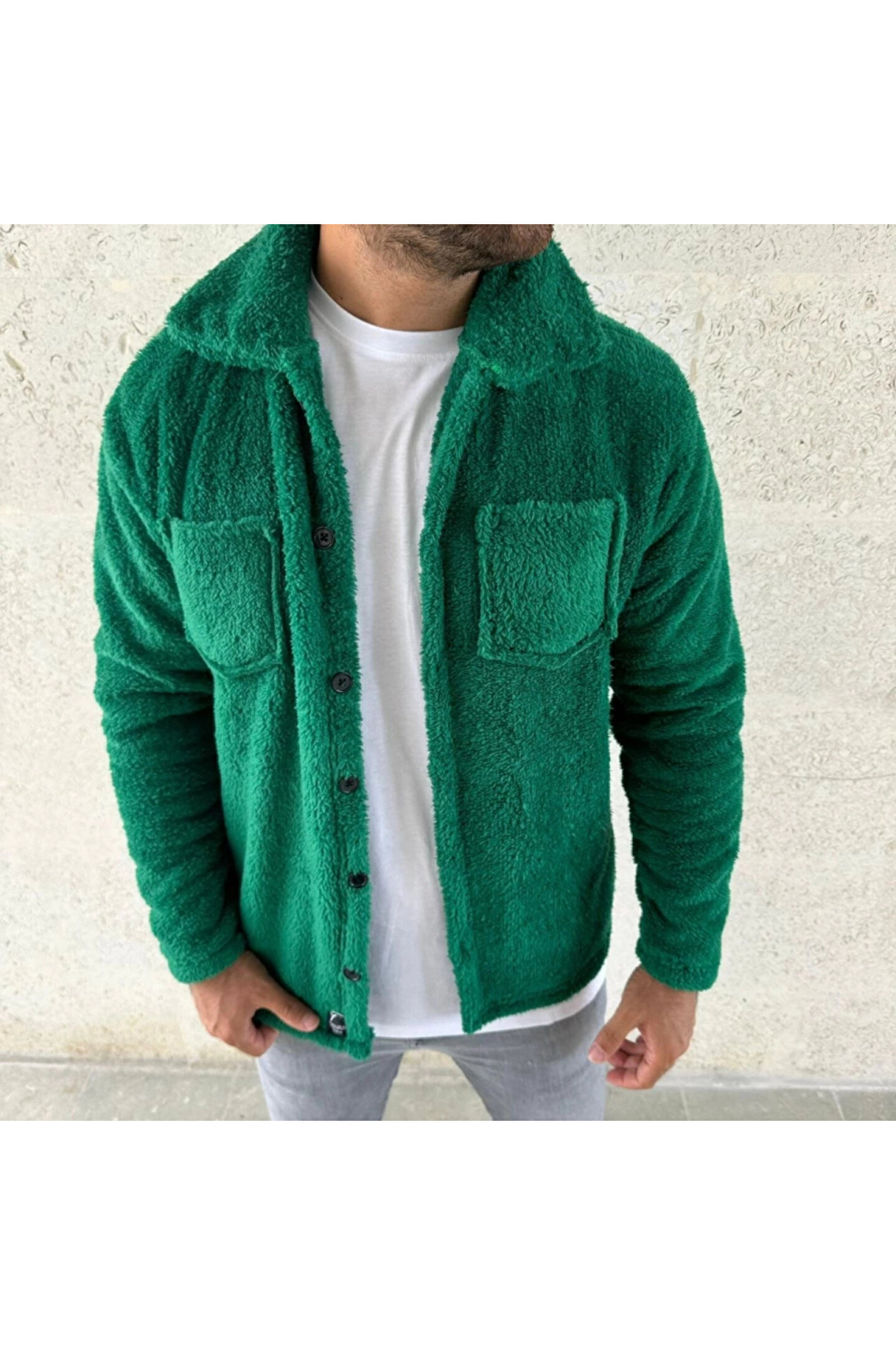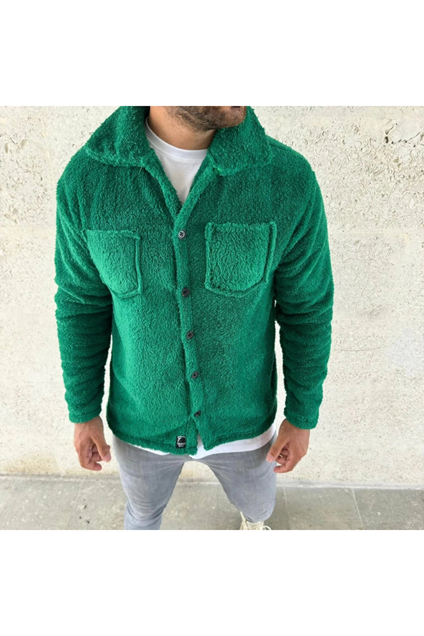 Erkek Pelüş Polar Hırka Gömlek – Yakalı, İlik Düğmeli, Göğüs Cepli, Yumuşak Dokulu Kışlık Regular Fit Rahat Günlük Model - Çimen Yeşili