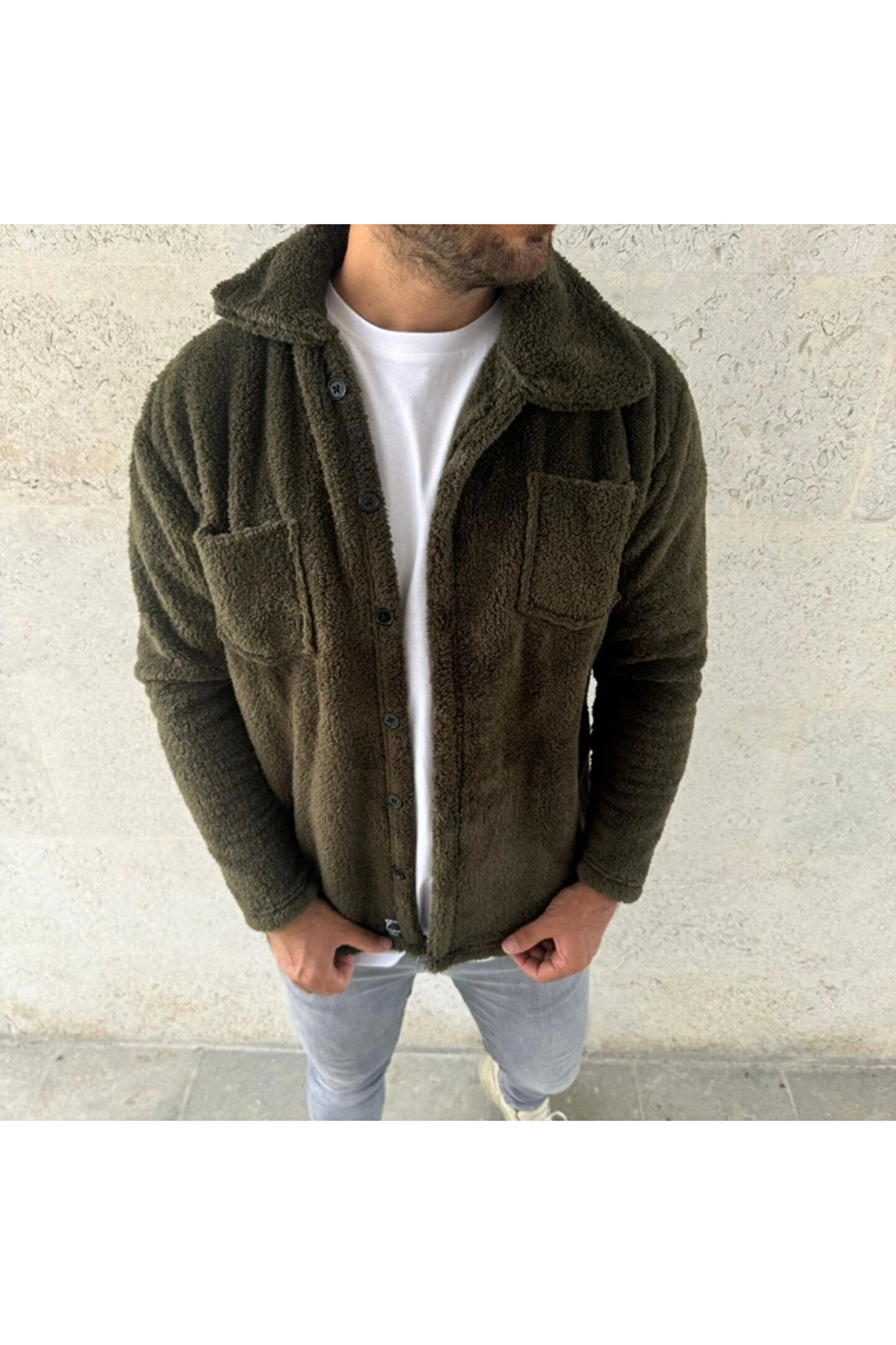 Erkek Pelüş Polar Hırka Gömlek – Yakalı, İlik Düğmeli, Göğüs Cepli, Yumuşak Dokulu Kışlık Regular Fit Rahat Günlük Model - Haki